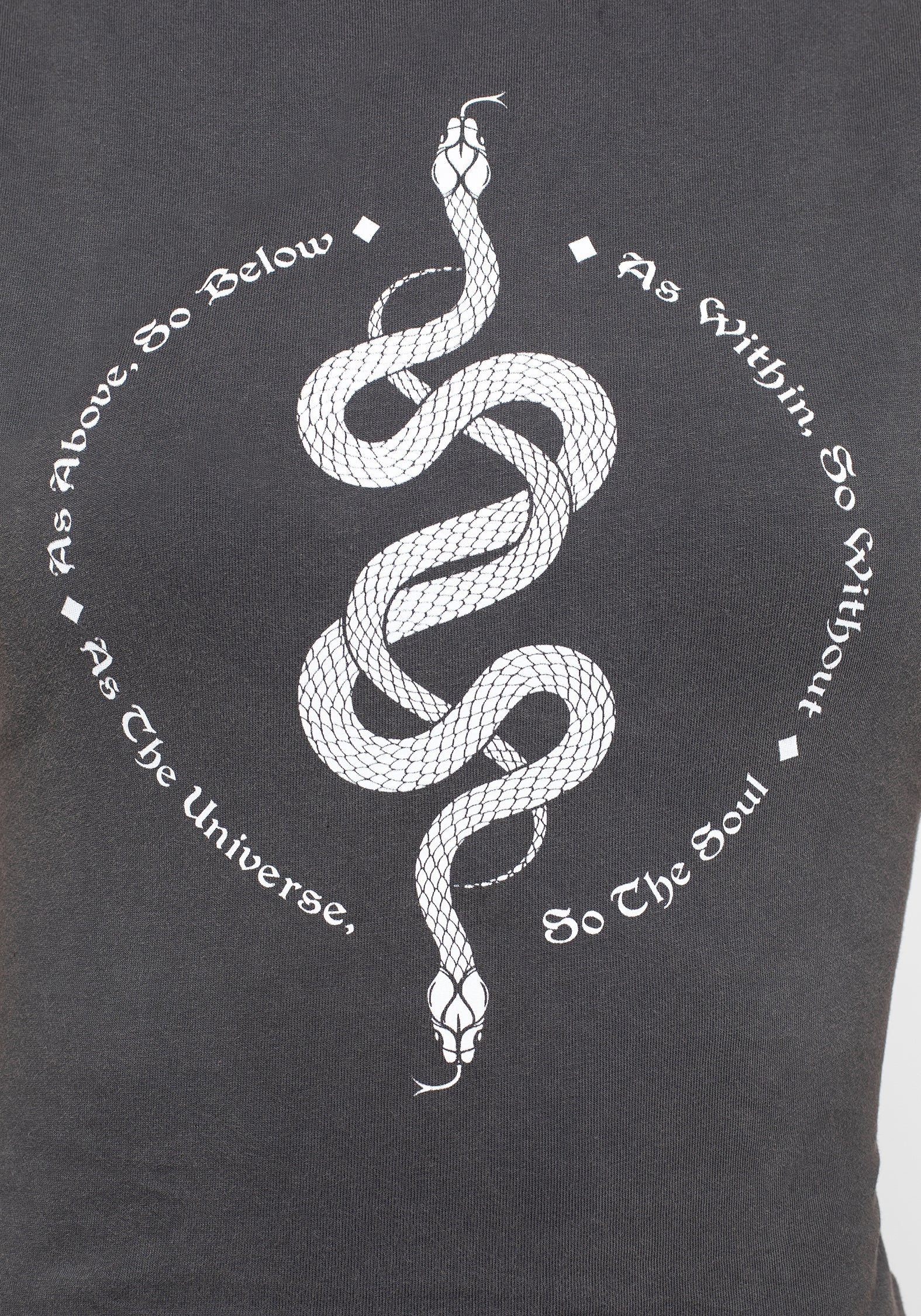 - White graphic snake print on front features a Hermetic “As Above, So Below” motif