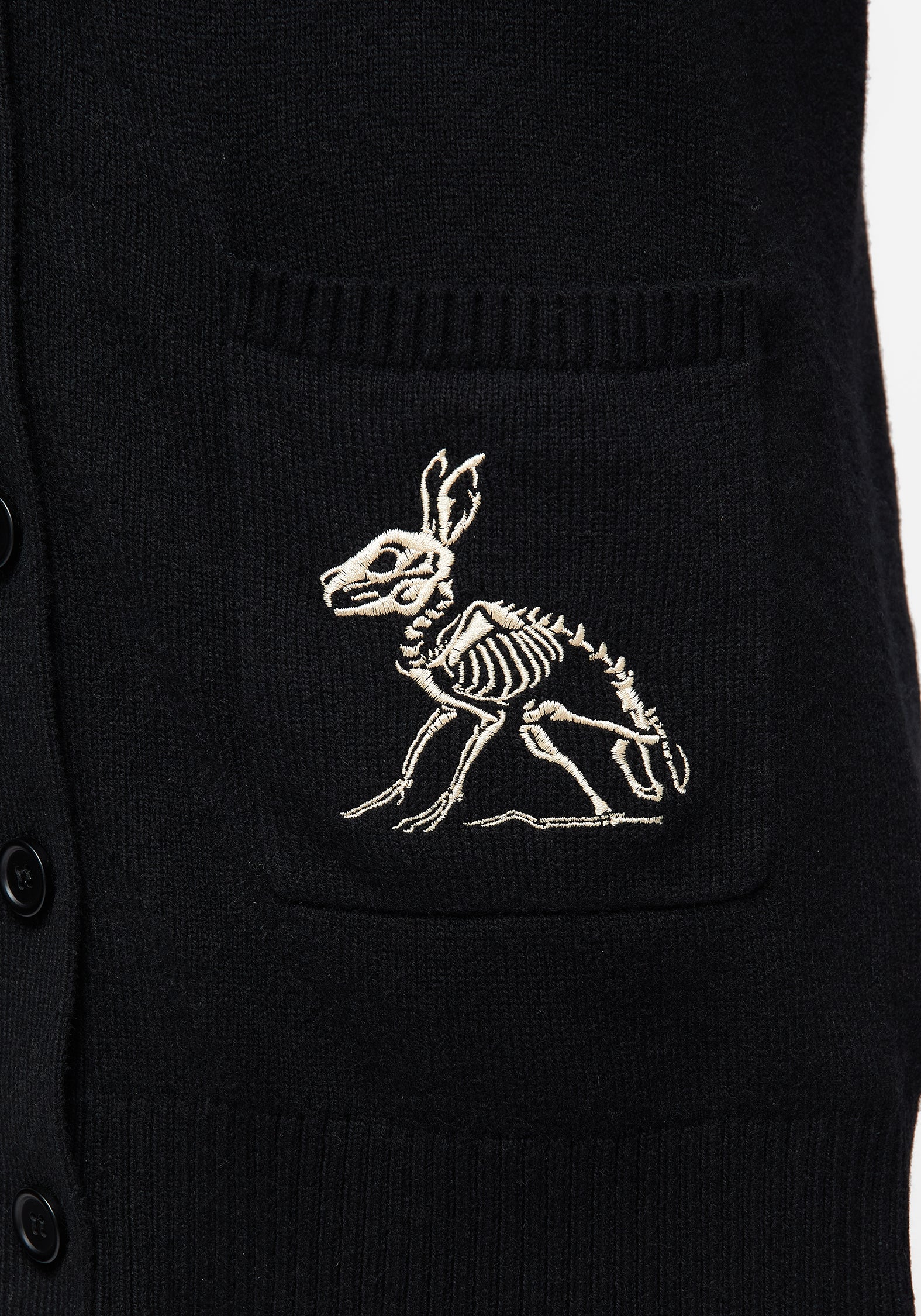 - Pale metallic cream embroidery features flora, moon, & skeletal rabbit motifs