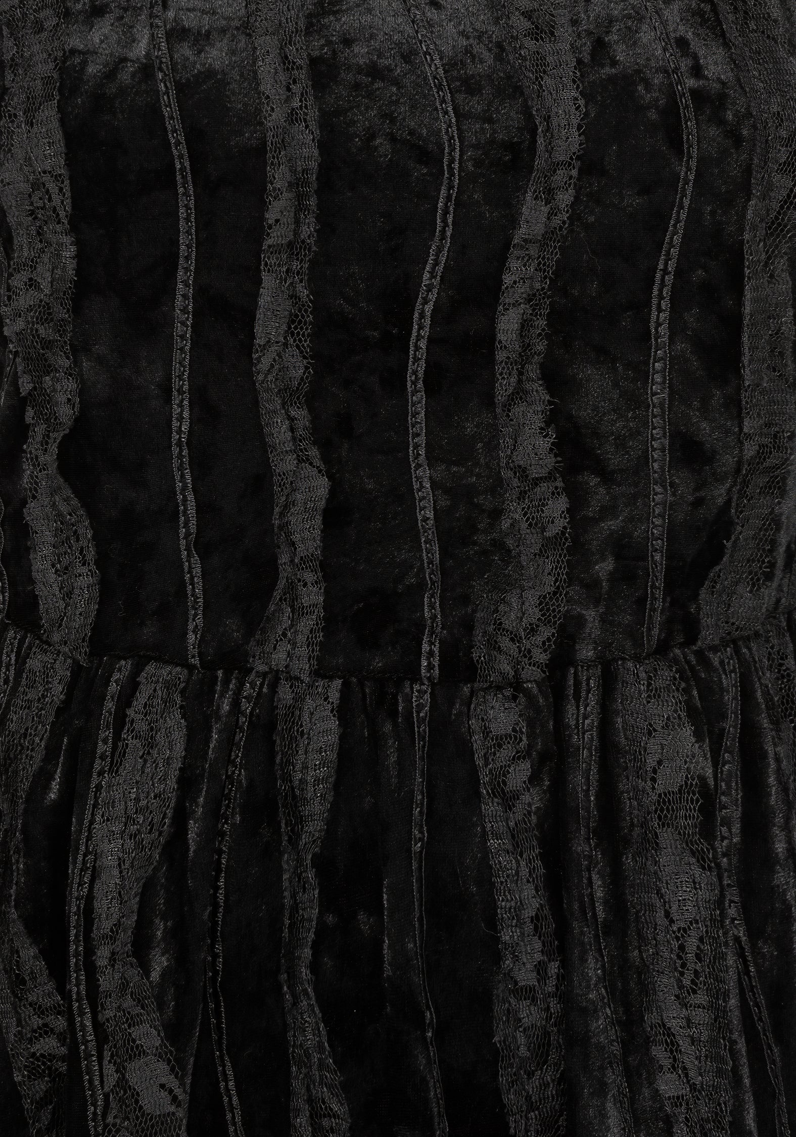 - Luxe velour fabrication with vertical stripes of floral lace sewn on