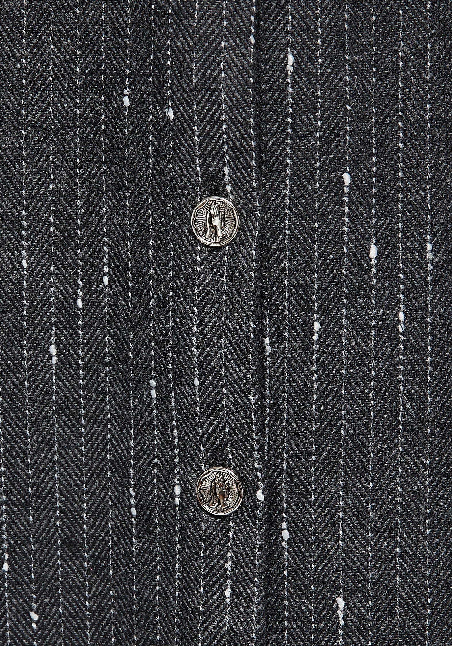 - Wool-blend grey herringbone fabric with white pinstriping
