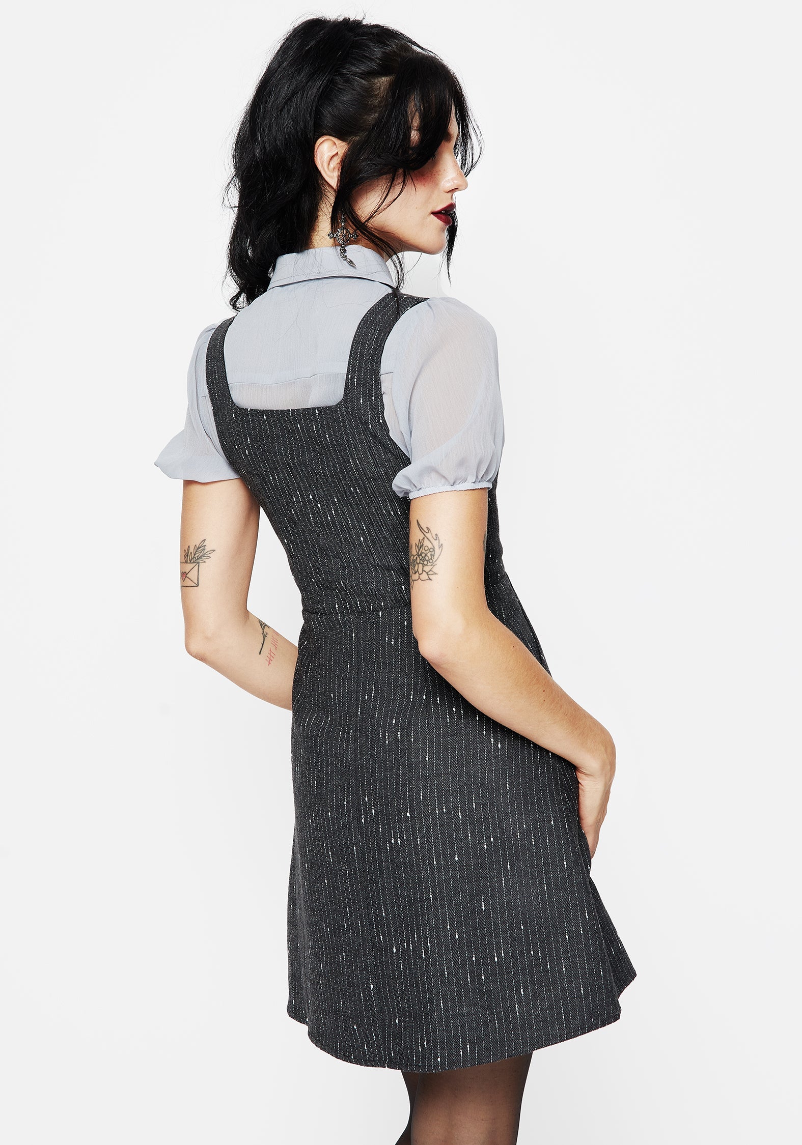 - Grey herringbone mini pinafore dress