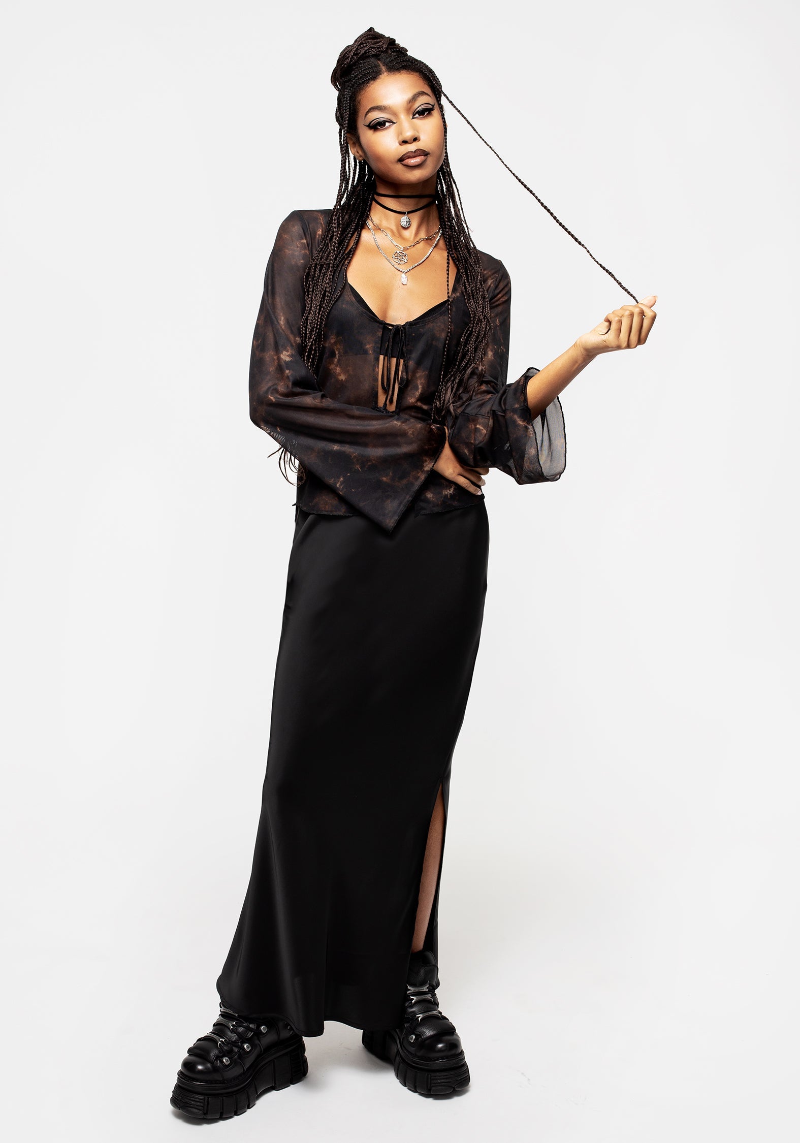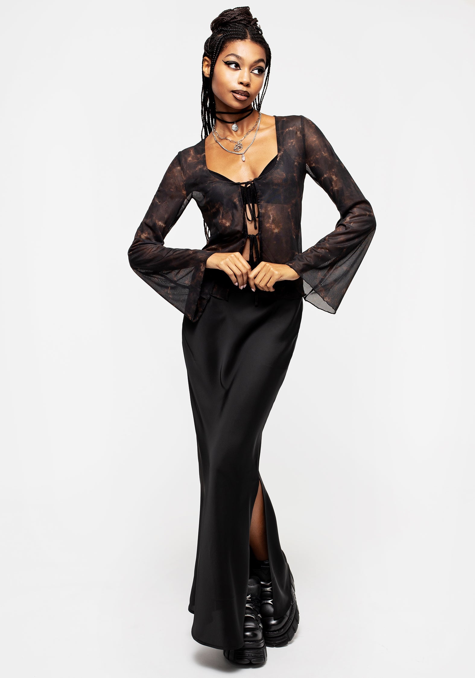 - Sheer marbled tie-dye fabric in warm earthy brown tones