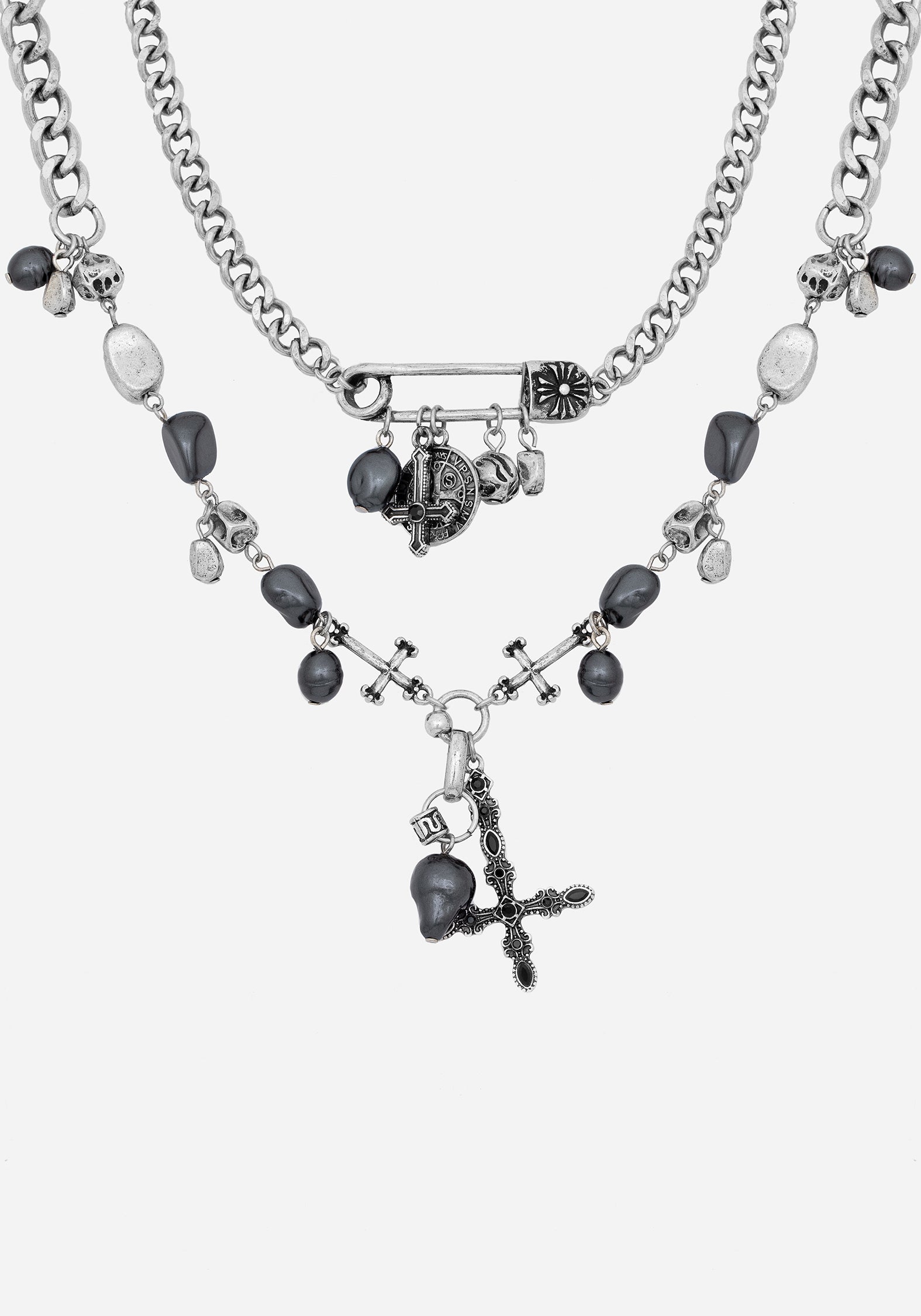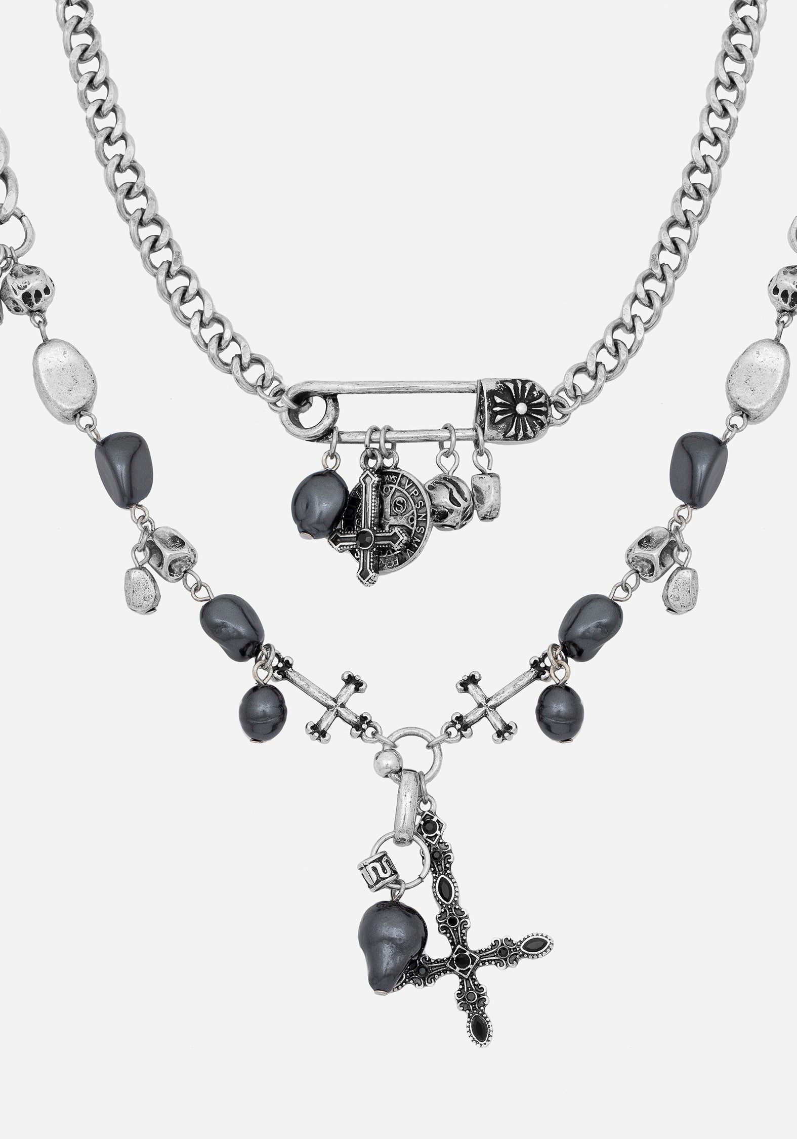 There’s enchantment in the light! This necklace set features two statement pieces that can be layered together or worn separately. A simple curb link chain is interrupted by a faux safety pin charm adorned with “scavenged” goods: an inverted cross, a coin, organic shapes & a grey-blue imitation pearl. Meanwhile, an imitation pearl necklace with crucifix pendants furthers that just found aesthetic that every sea witch desires.