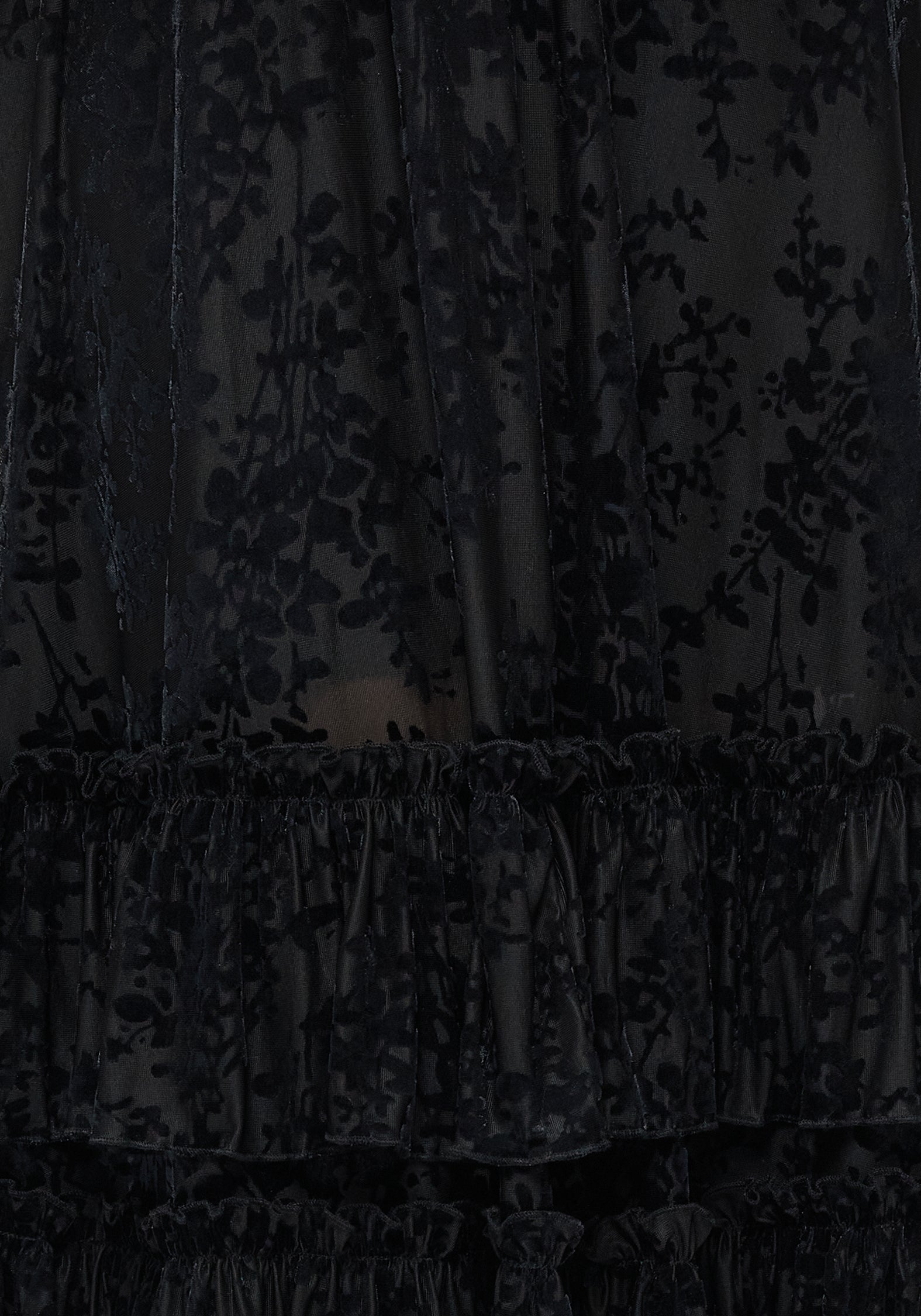 - Sheer black stretch fabric with a floral flocked velvet pattern