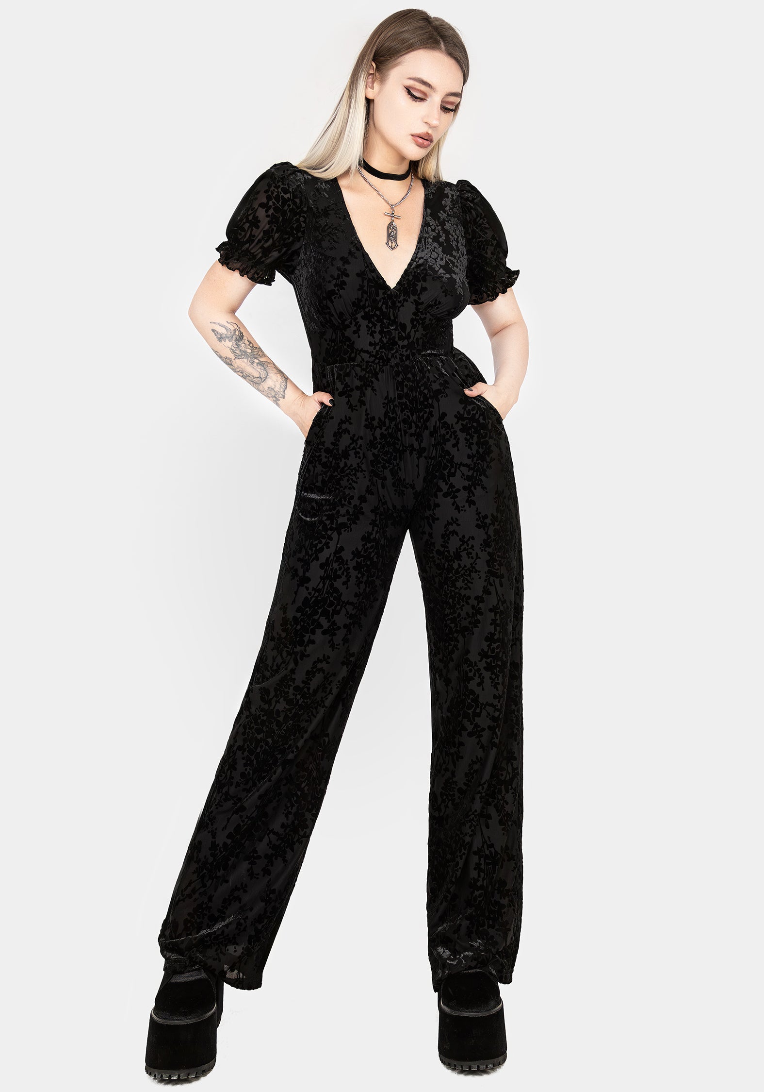 - Sheer black stretch fabric with a floral flocked velvet pattern