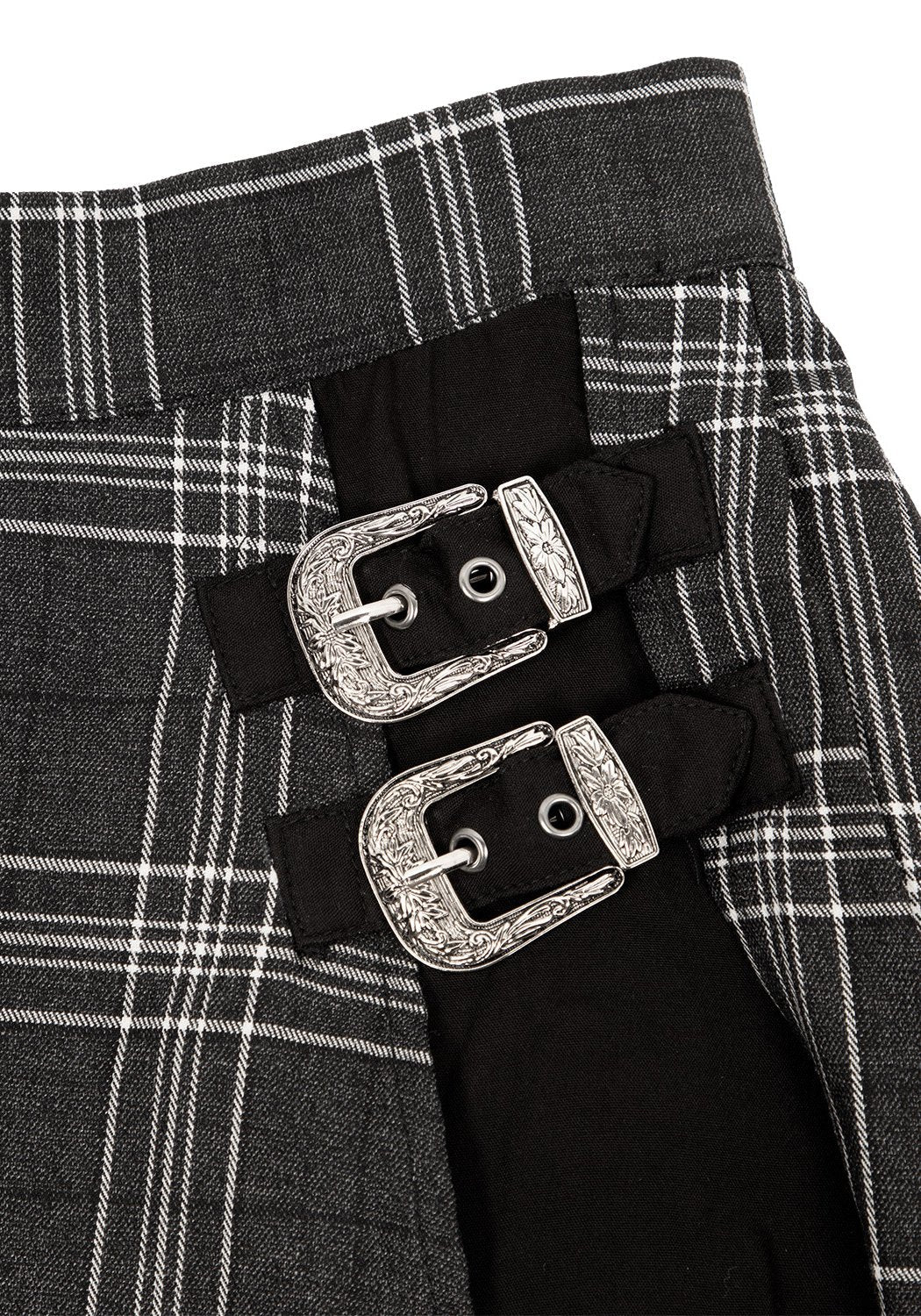 - Shorter section on left thigh, punctuated by statement double buckle in silver metal