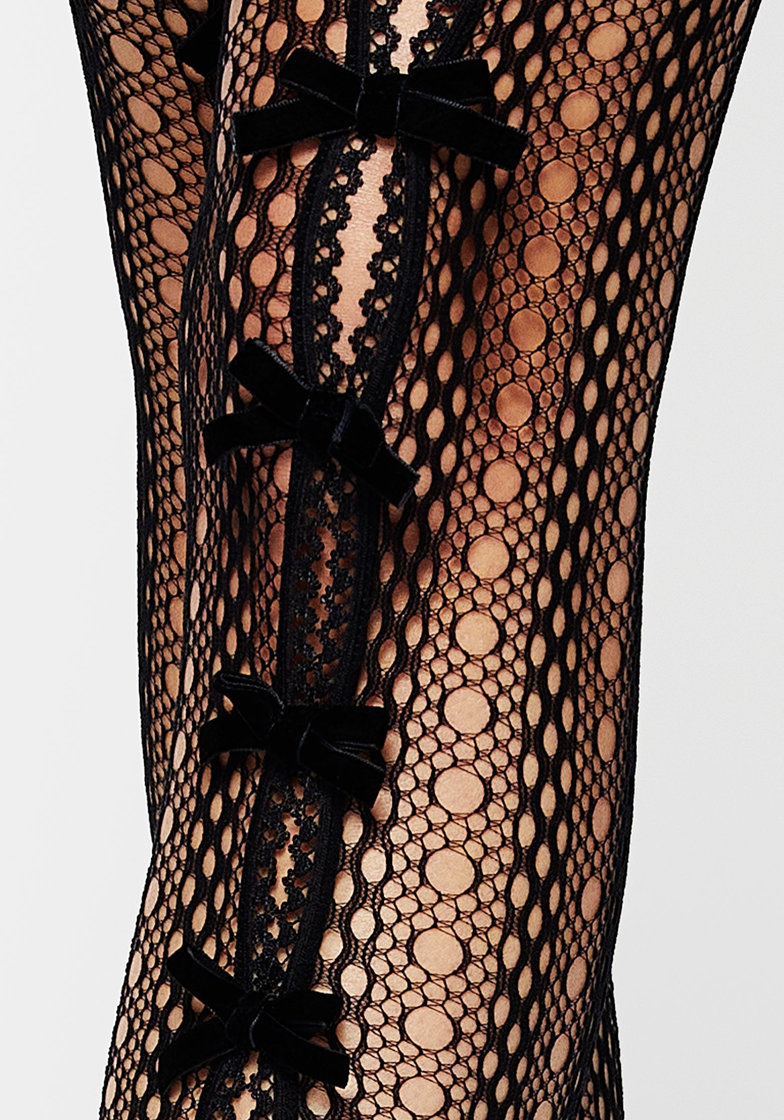 - Black cut-out lace fishnet tights with velour bows