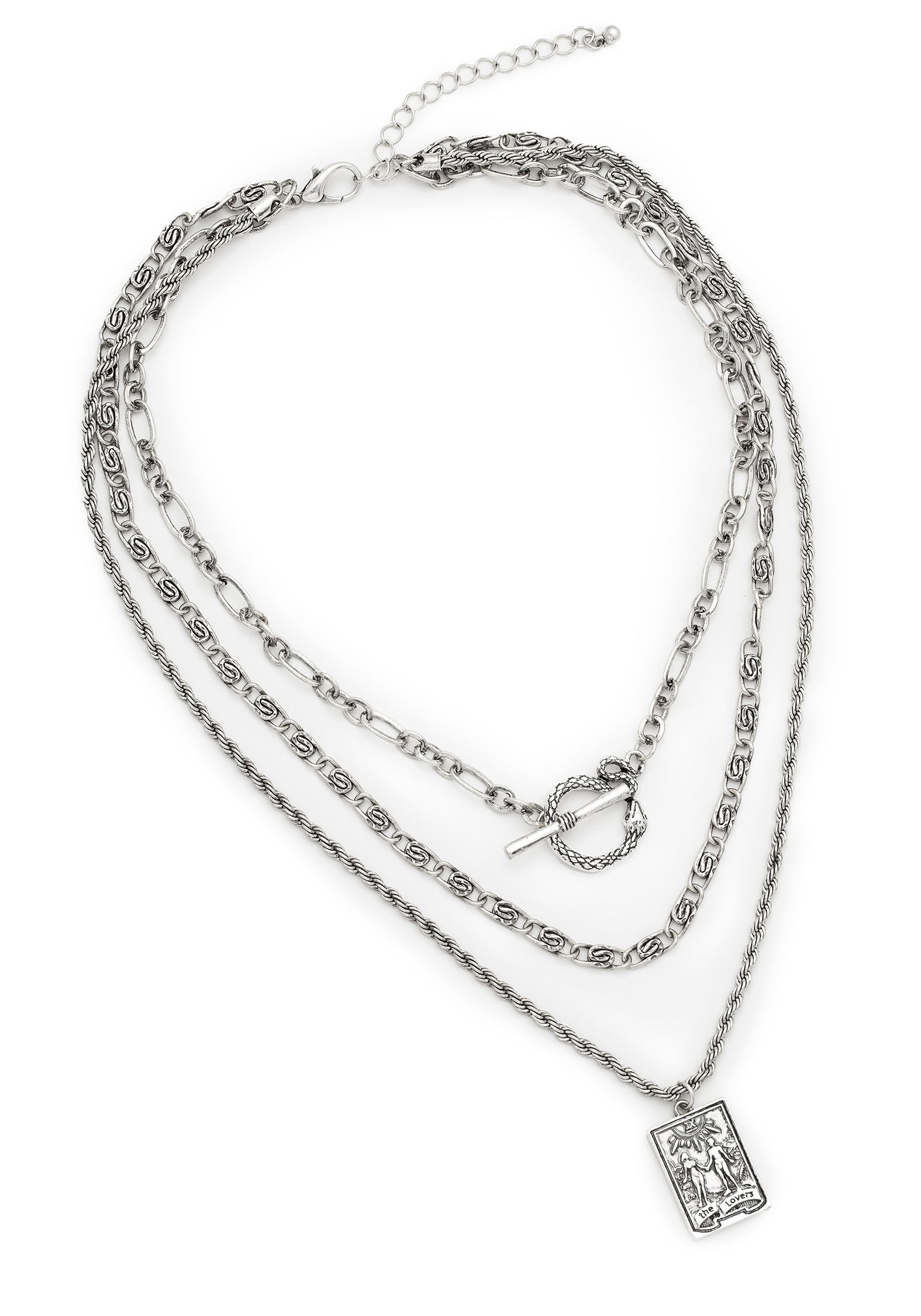 A mystical silver mixed chain pendant necklace featuring rope, figaro & twisted chains for a dimensional finish. A silver ouroboros snake T-bar fastening embellishes its shortest chain, while an intricate The Lovers tarot card charm completes this statement piece.