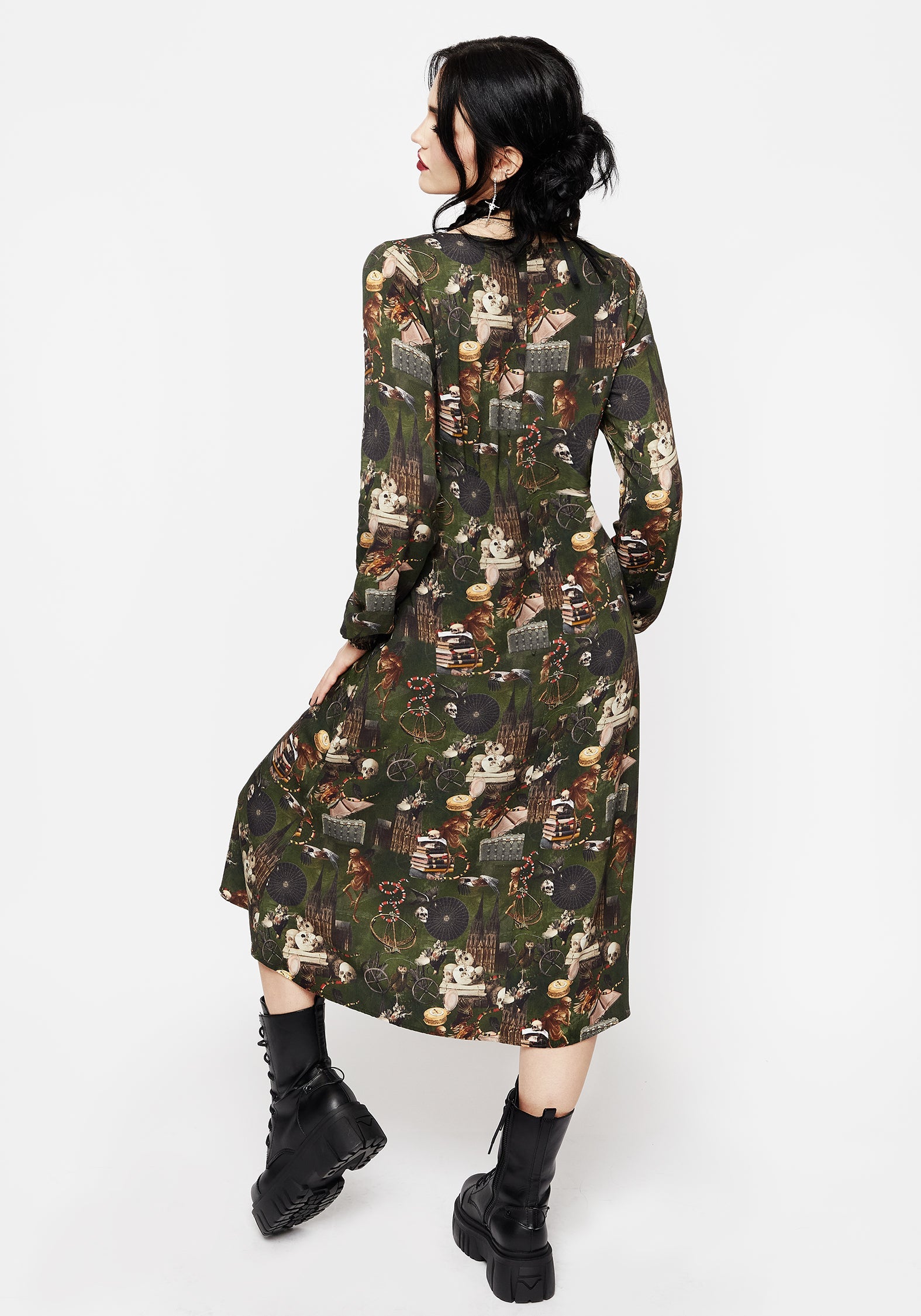 - Dark Academia inspired all-over digital print on a deep green base features skeletons, snakes & witchy materials