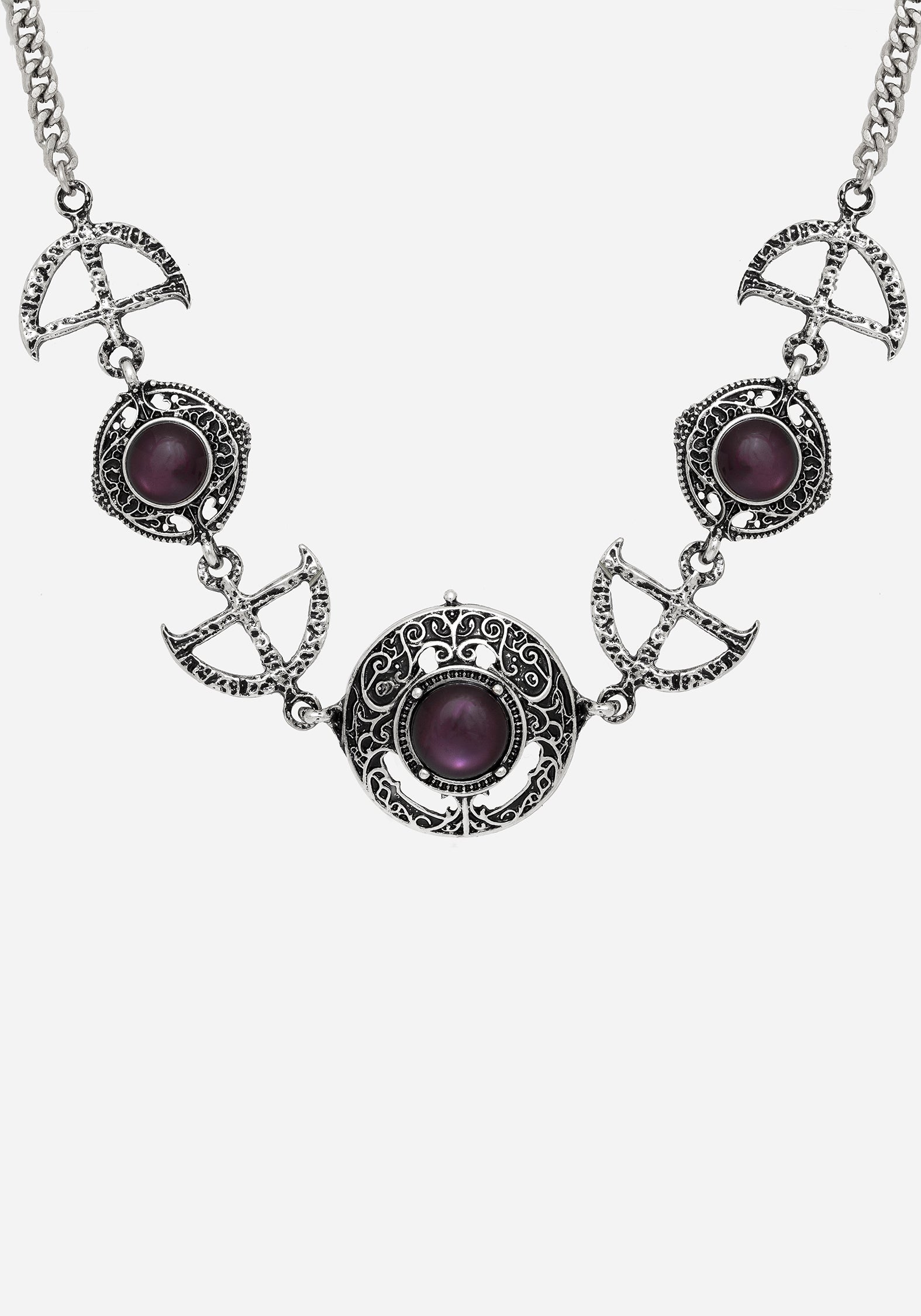 A bewitchingly beautiful silver charm choker necklace with Occult-inspired moulded pendants & rich purple gems.