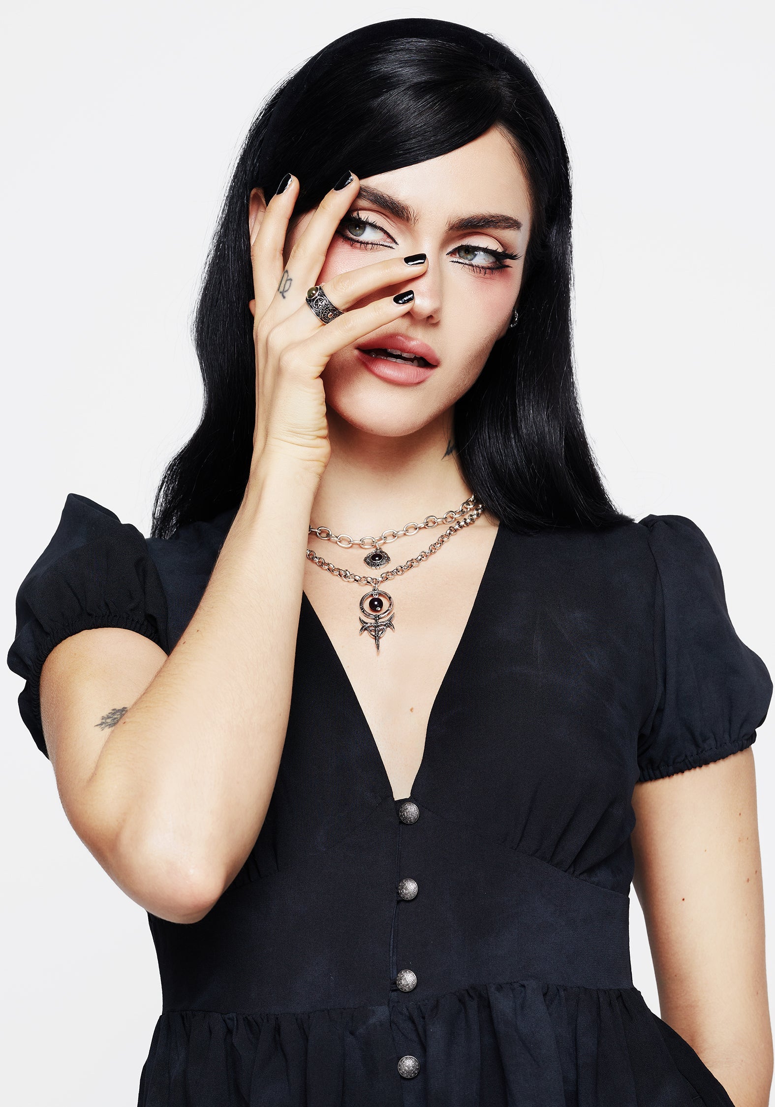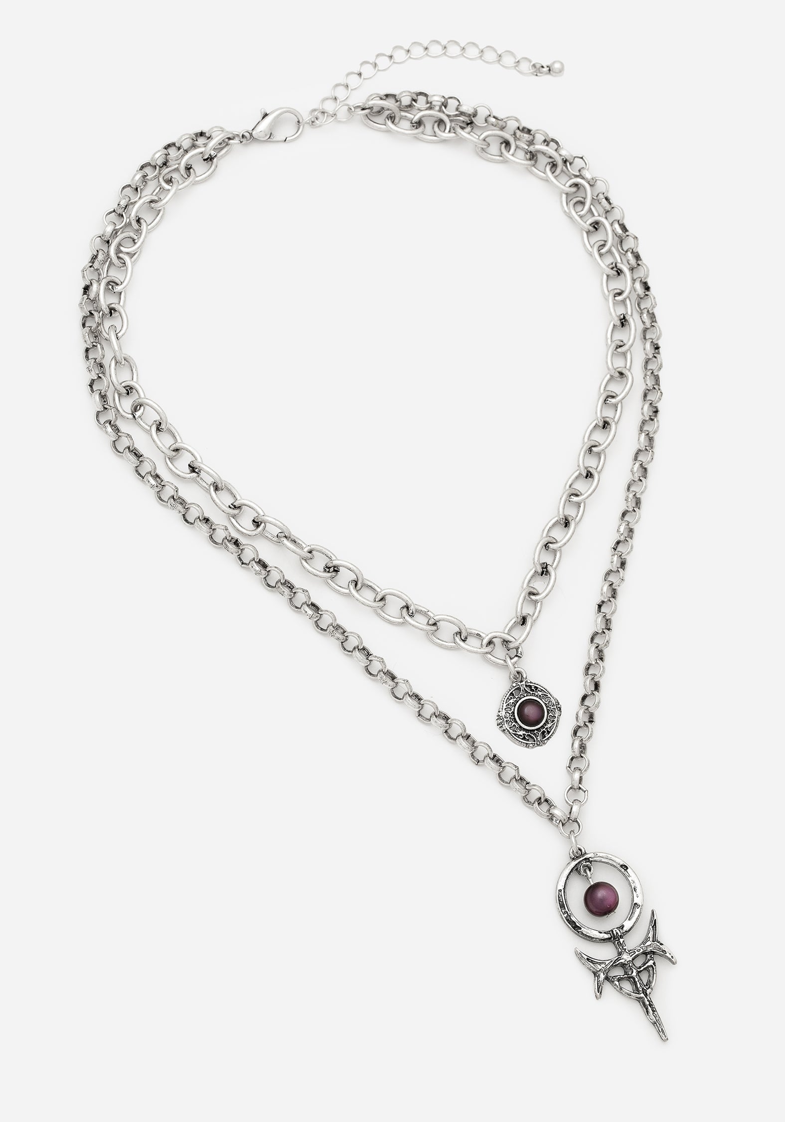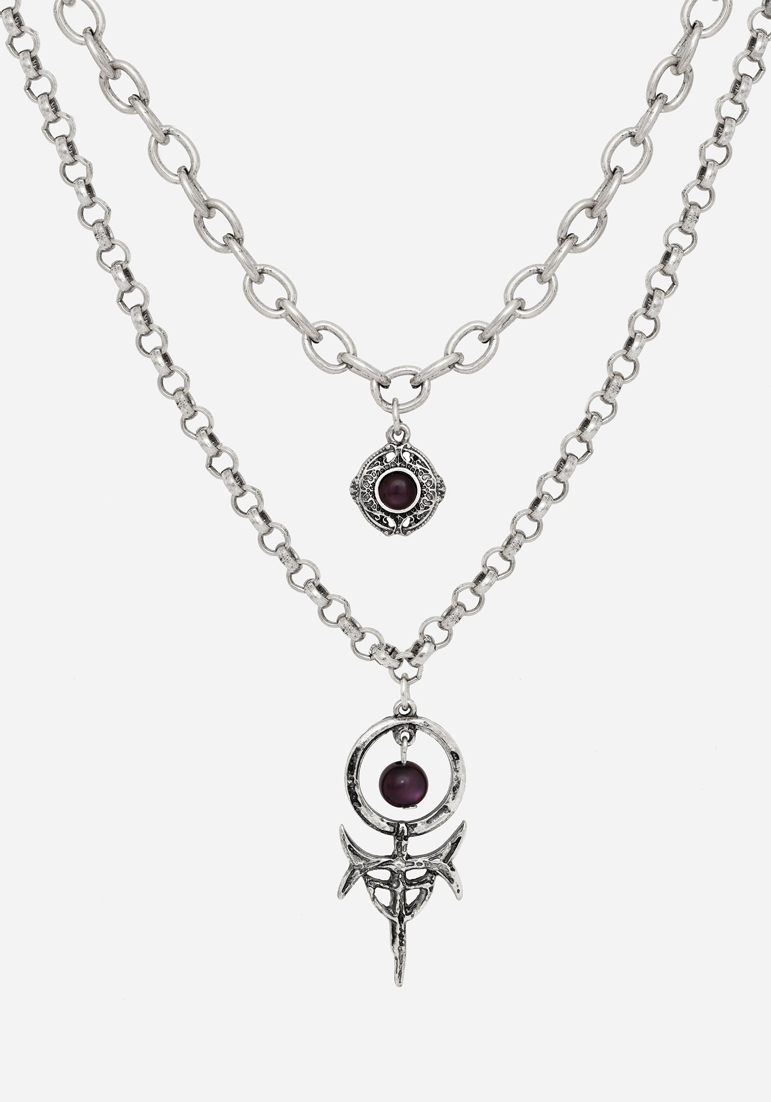A bewitchingly beautiful silver mixed chain layered necklace with Occult-inspired moulded pendants & rich purple gems.