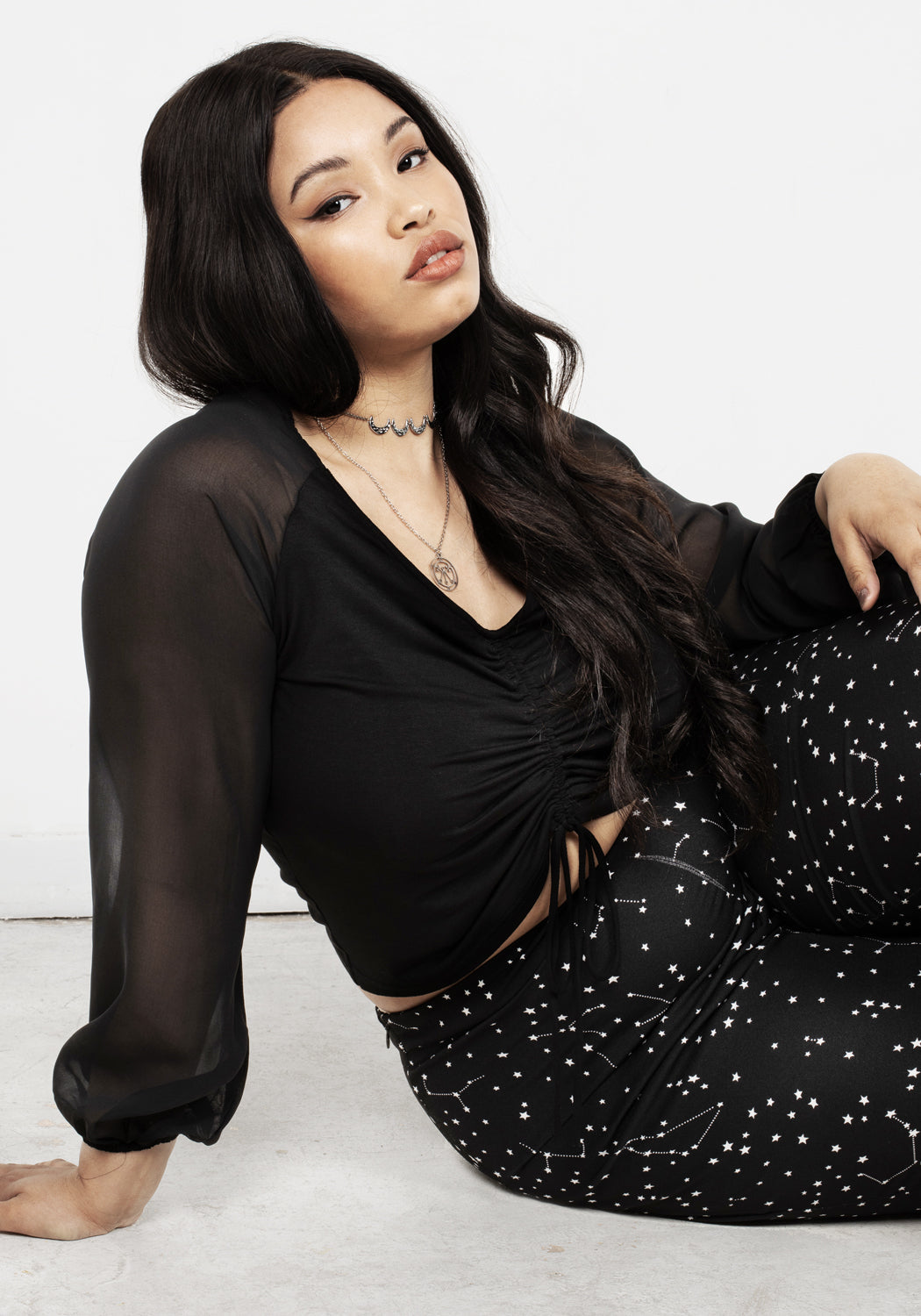 ❦ Sheer sleeve ruched crop top in black