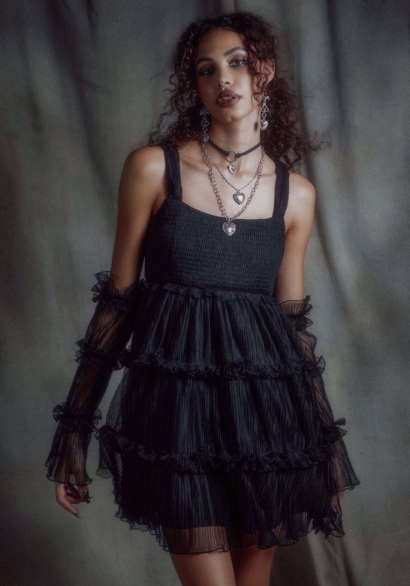 - Black crinkle tulle cami mini dress with detached sleeves