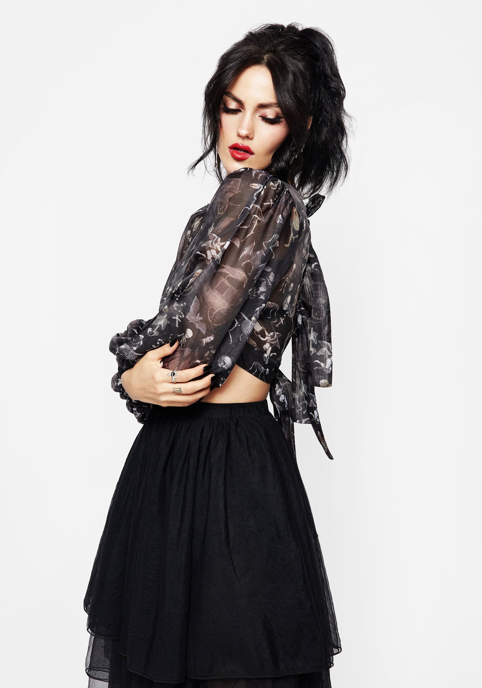 - Lightweight floaty sheer organza features a ghoulish Victorian-inspired skeleton print (all-over design)
