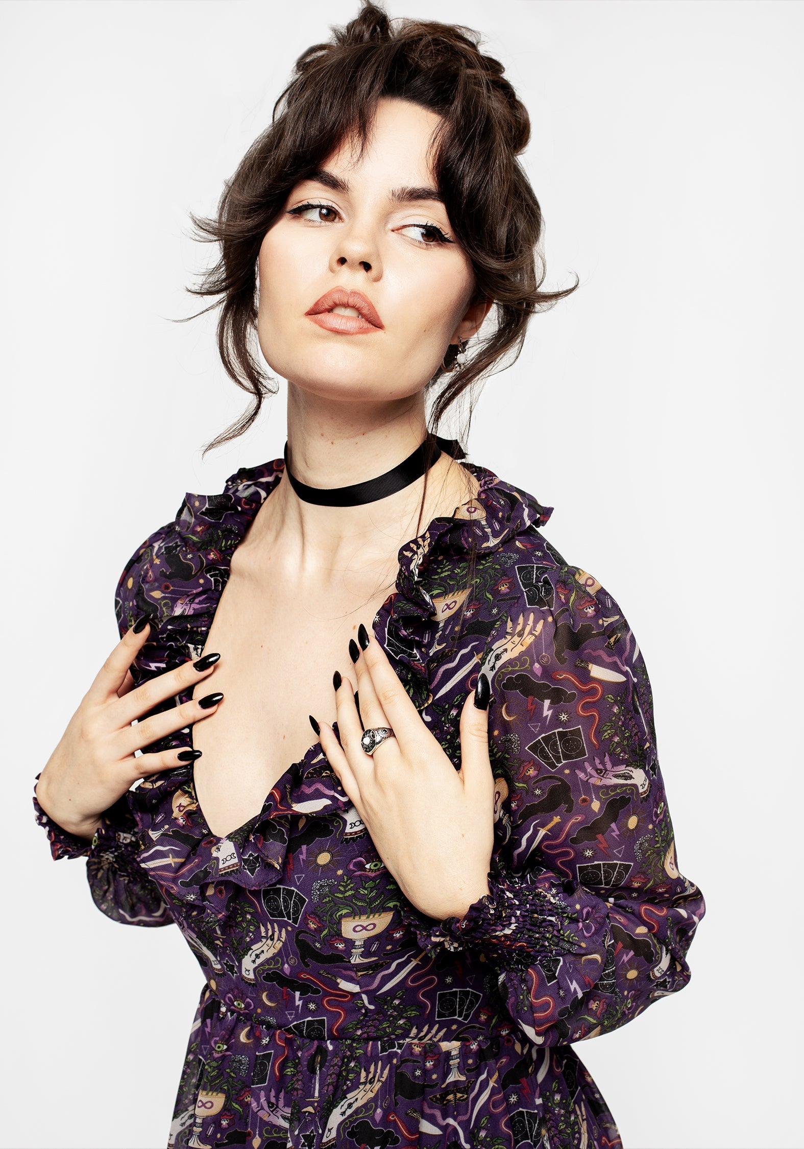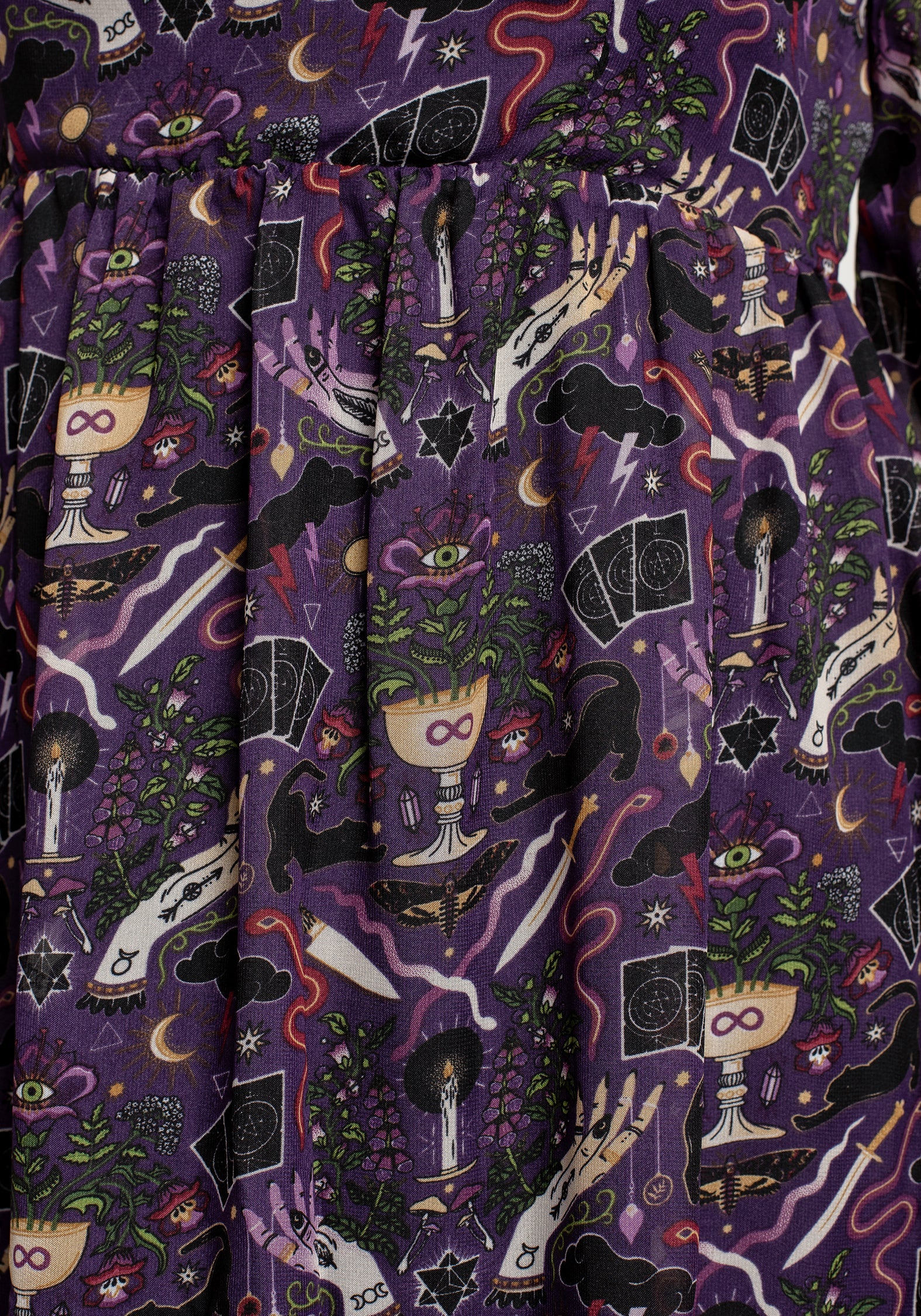 - Bewitching all-over Modern Mystic print features an eclectic mix of witchy symbols on a deep purple base
