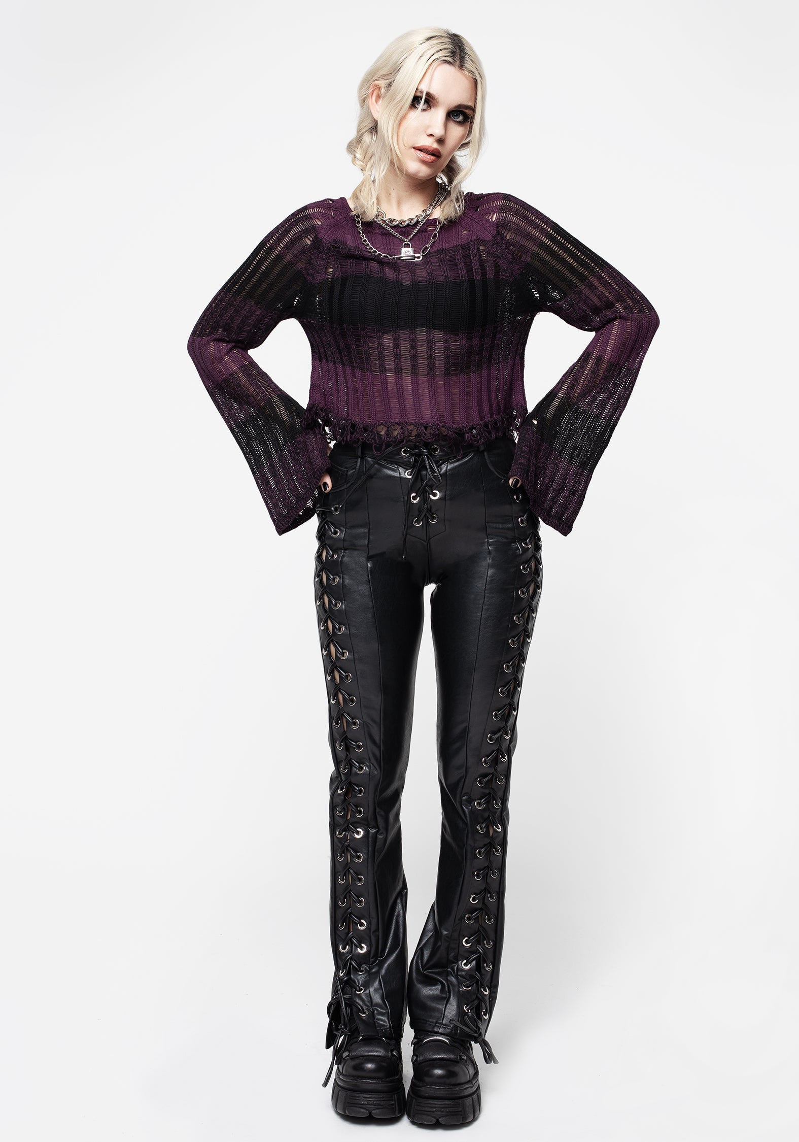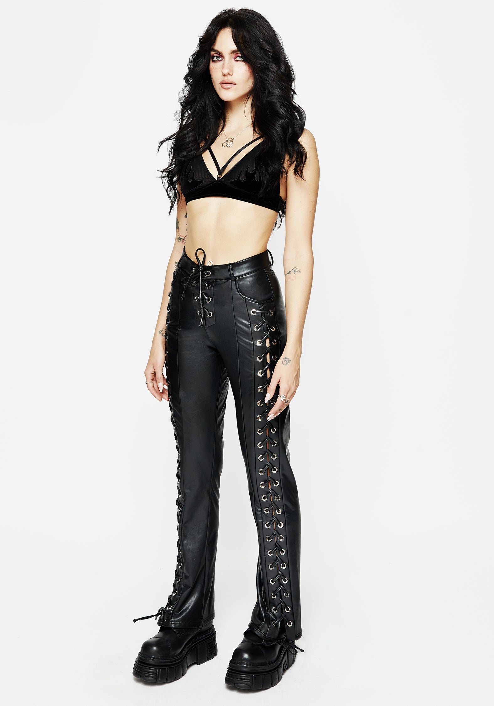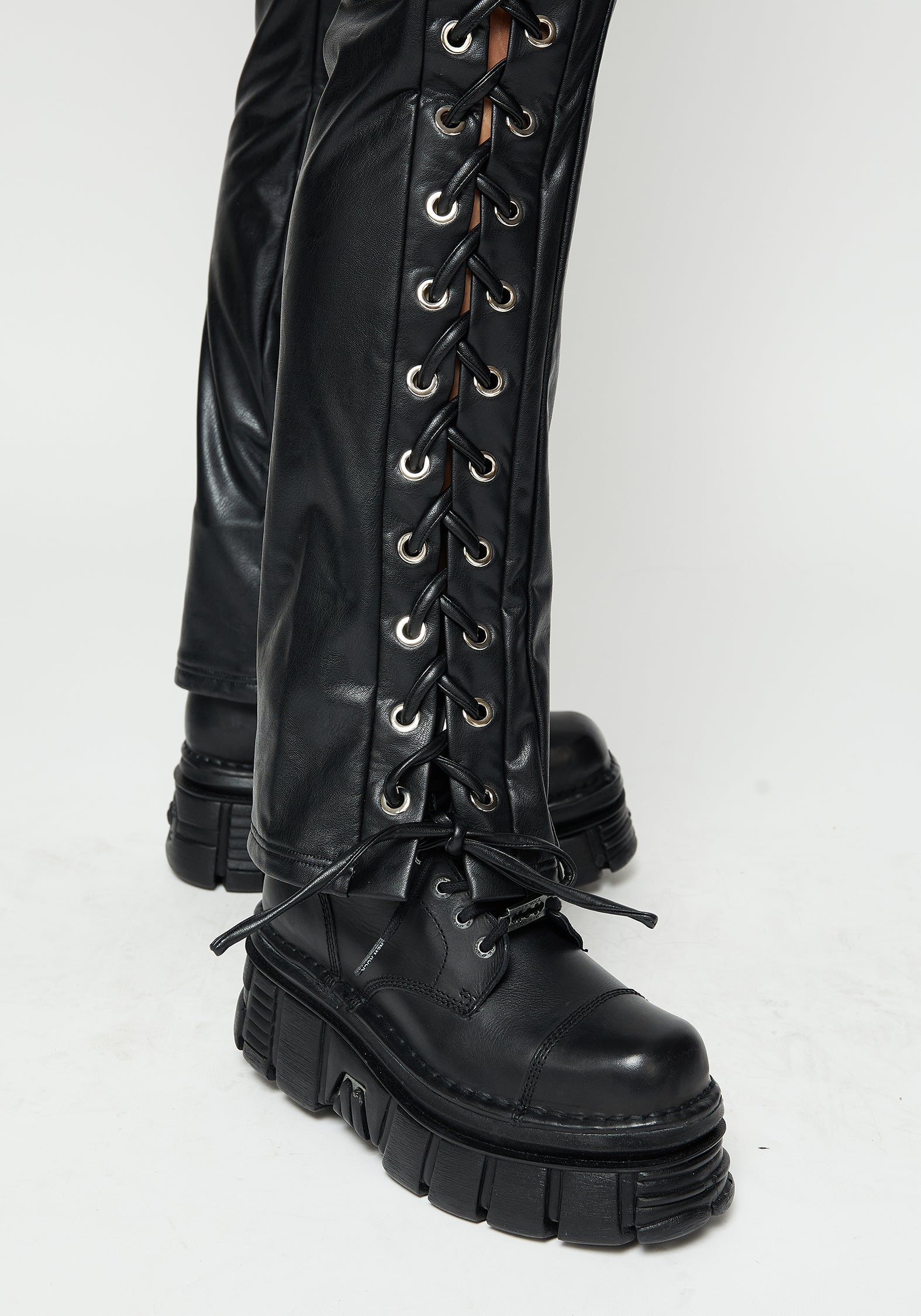 - PU leather cords thread through silver metal eyelets along leg side seams