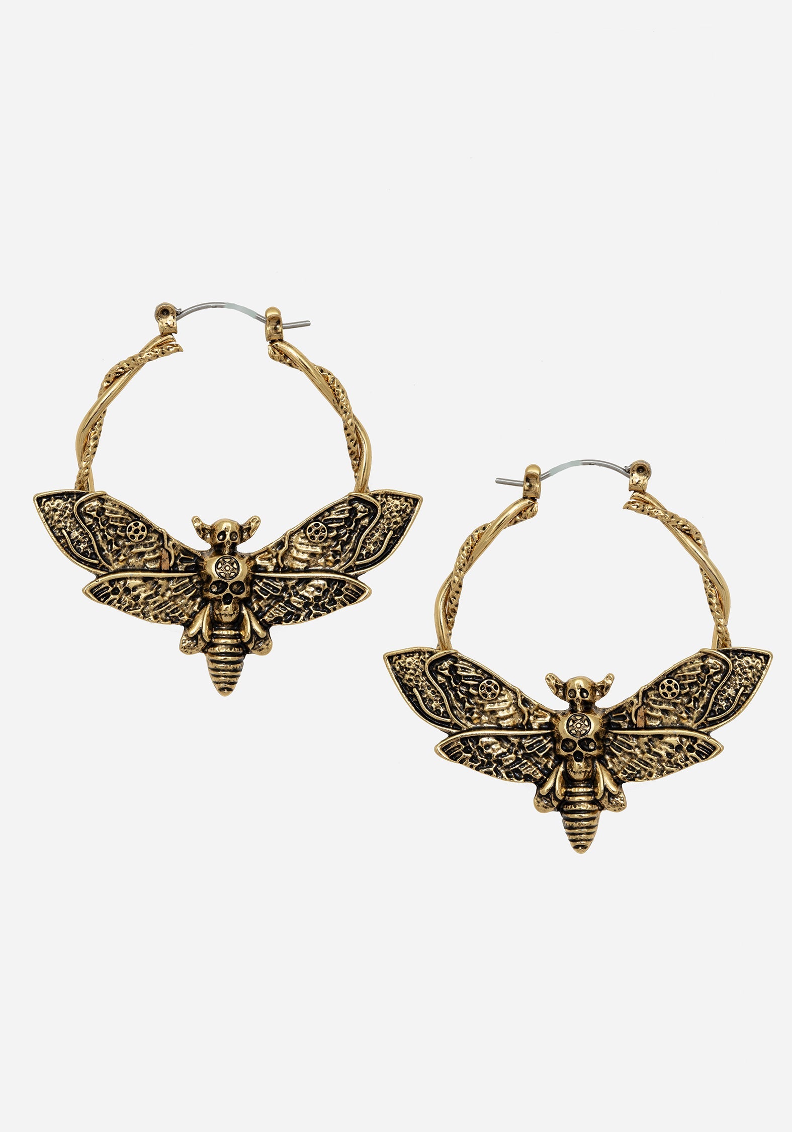 A foreboding symbol & harbinger of death to some, a cute aesthetic bug motif to others. We’re on both sides! The intricately moulded death’s head hawkmoth charm hangs from gold hoops entwined with a rope-look detail. The antique gold plate finish adds dimension to let its features shine!