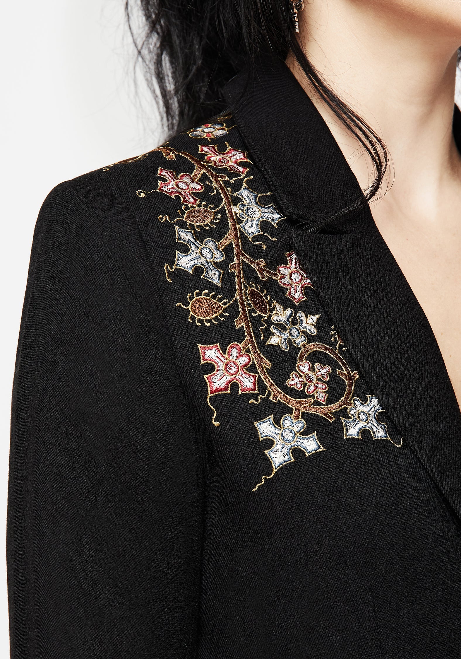 - Black heraldic floral embroidered blazer jacket