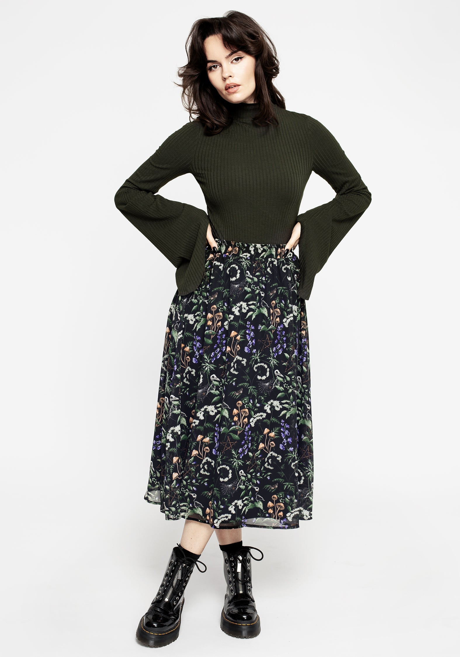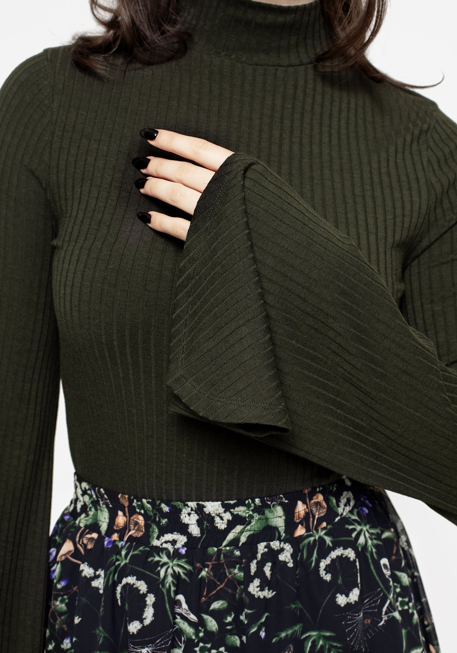 - Soft, stretchy ribbed jersey fabric in a muted khaki green
