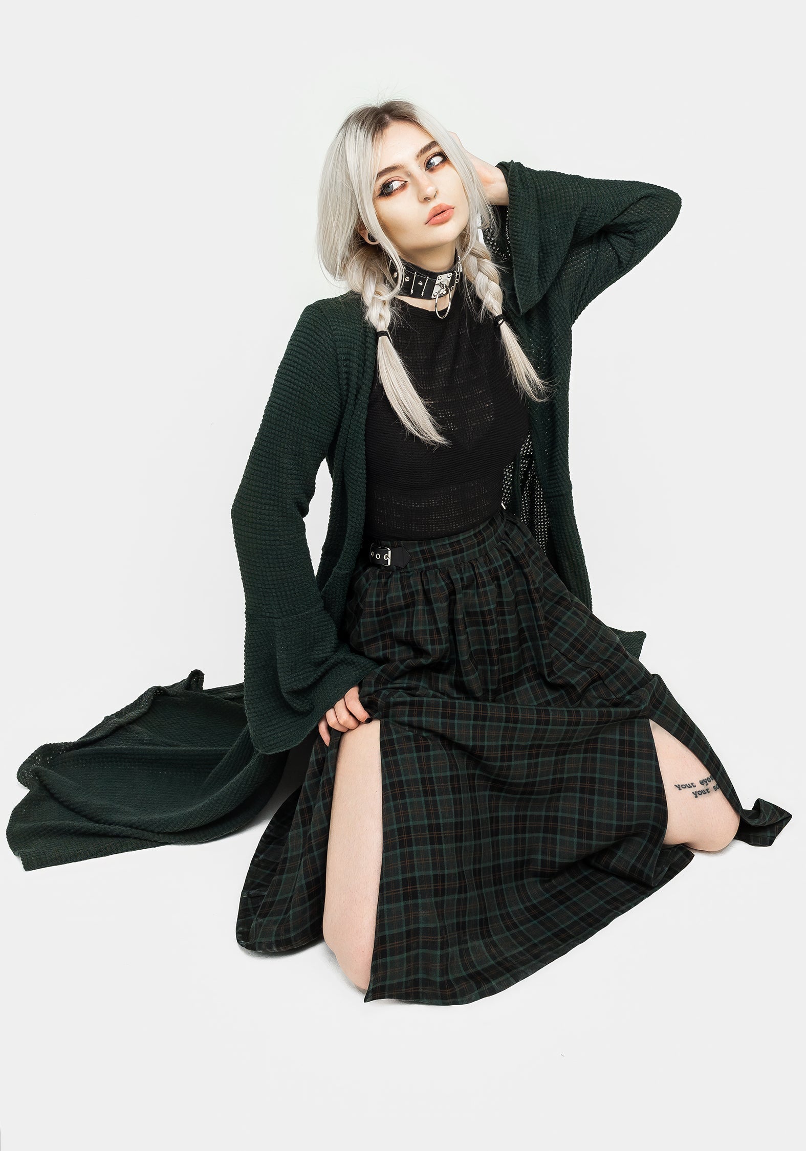 - Midi-length skirt falls in soft pleats with two sultry front splits to add movement