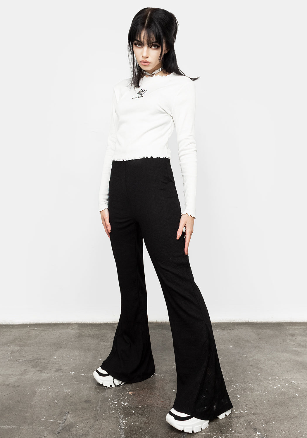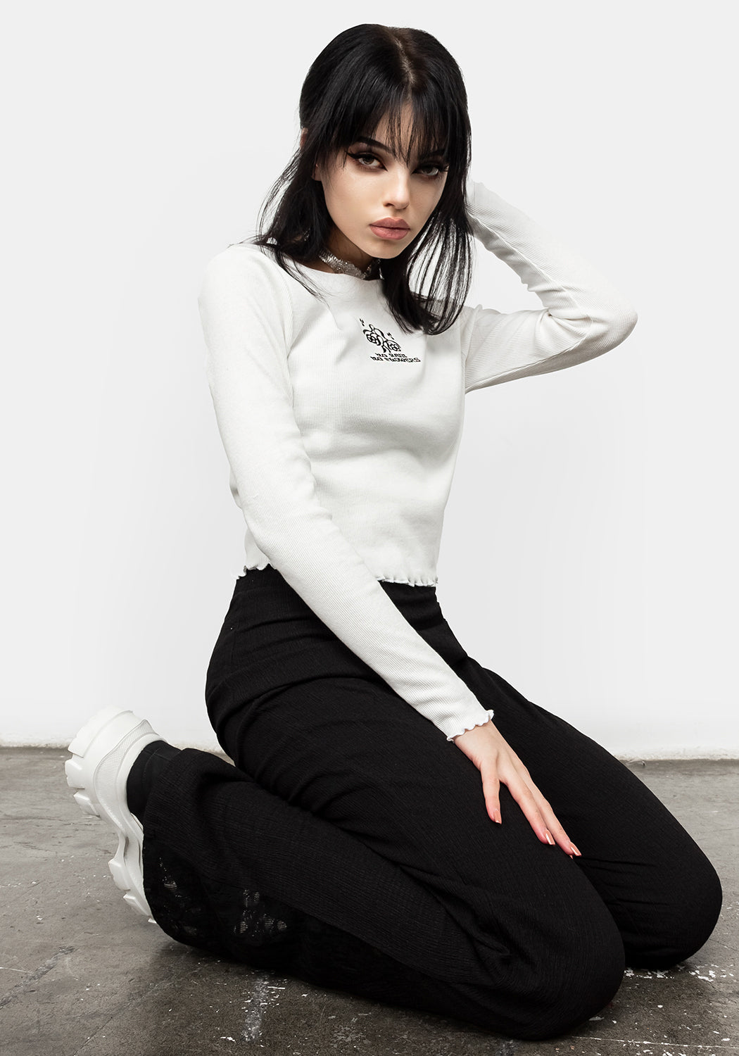 ✧ White ribbed long sleeve top with floral embroidery