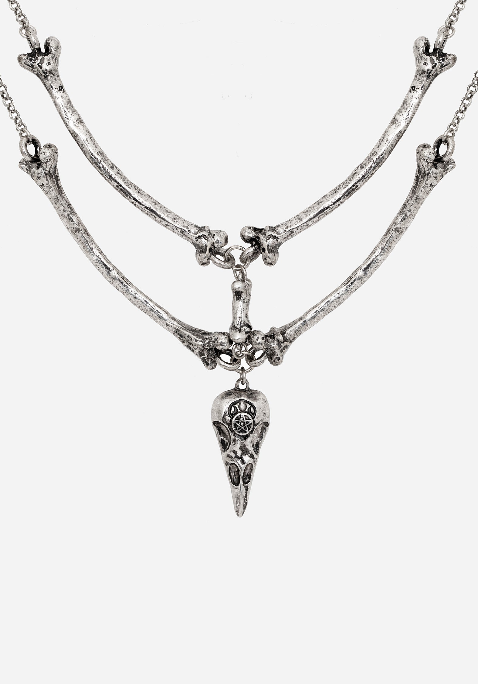 The bones never lie – this gothic choker necklace is for everyone with a penchant for the macabre. Large fibula charms link together to create a morbid look. The bone choker chain is finished with a pentagram-engraved raven skull charm.