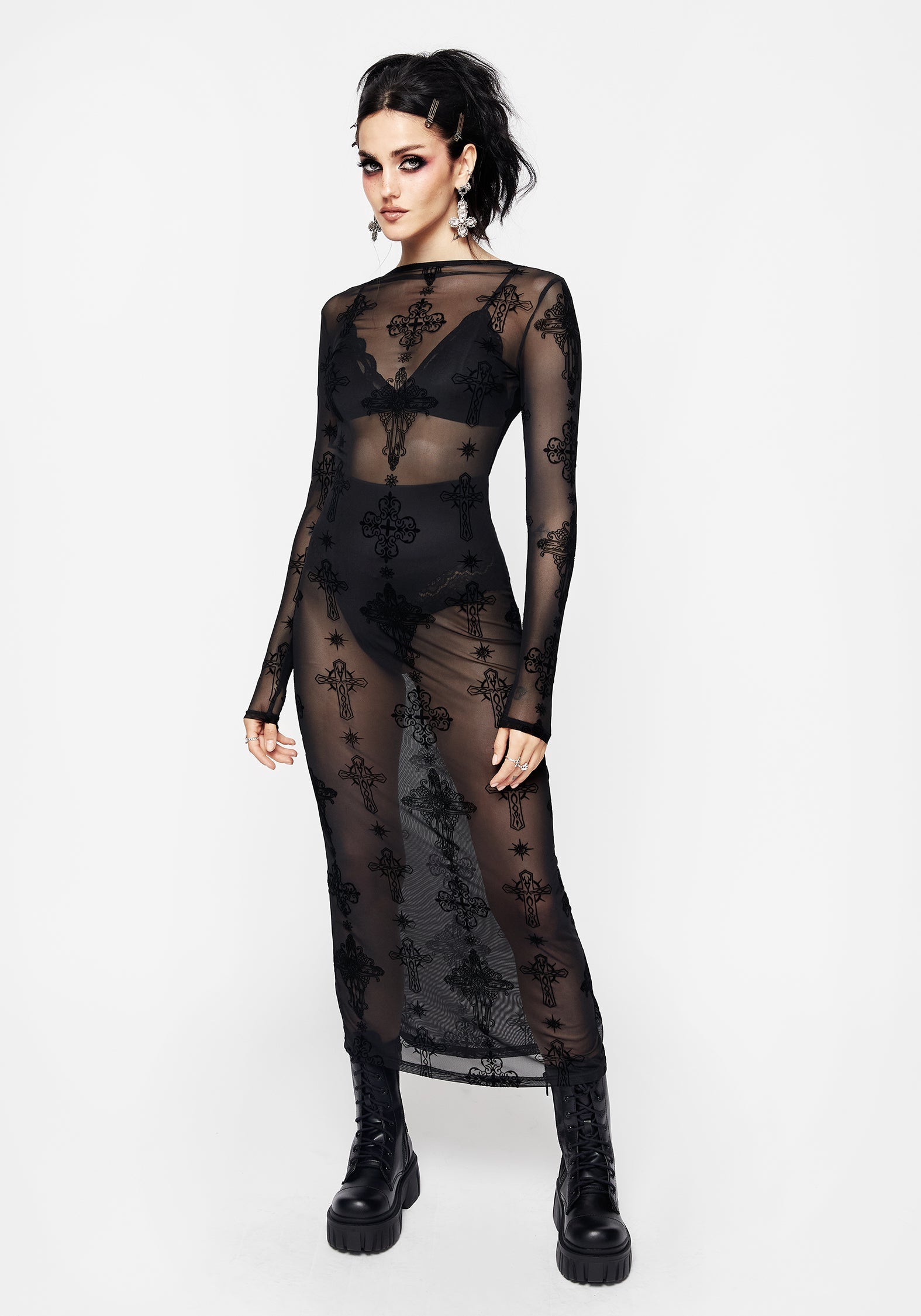 - Stretchy sheer mesh fabrication with flocked ornate crucifix design