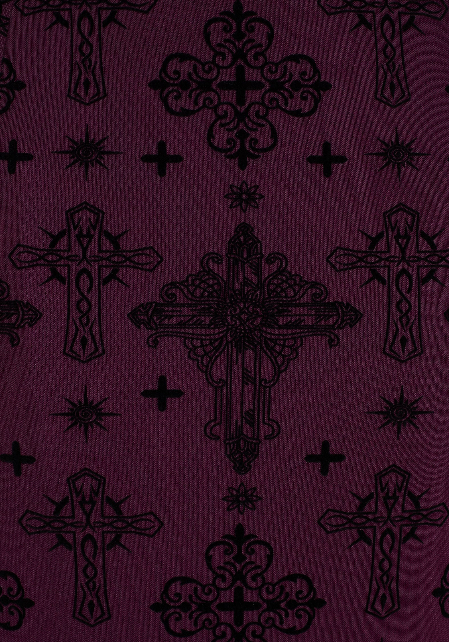 - Stretchy sheer mesh fabrication in a rich purple with flocked ornate crucifix design