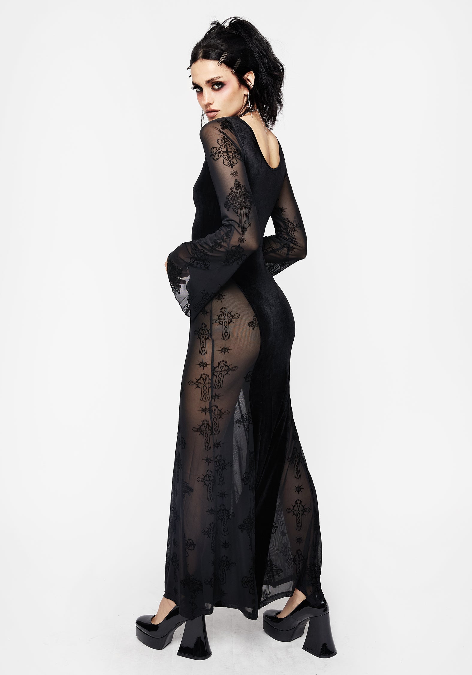 - Soft black velour fabric contrasts from flocked mesh jersey with ornate crucifix design (stretch fabrication)