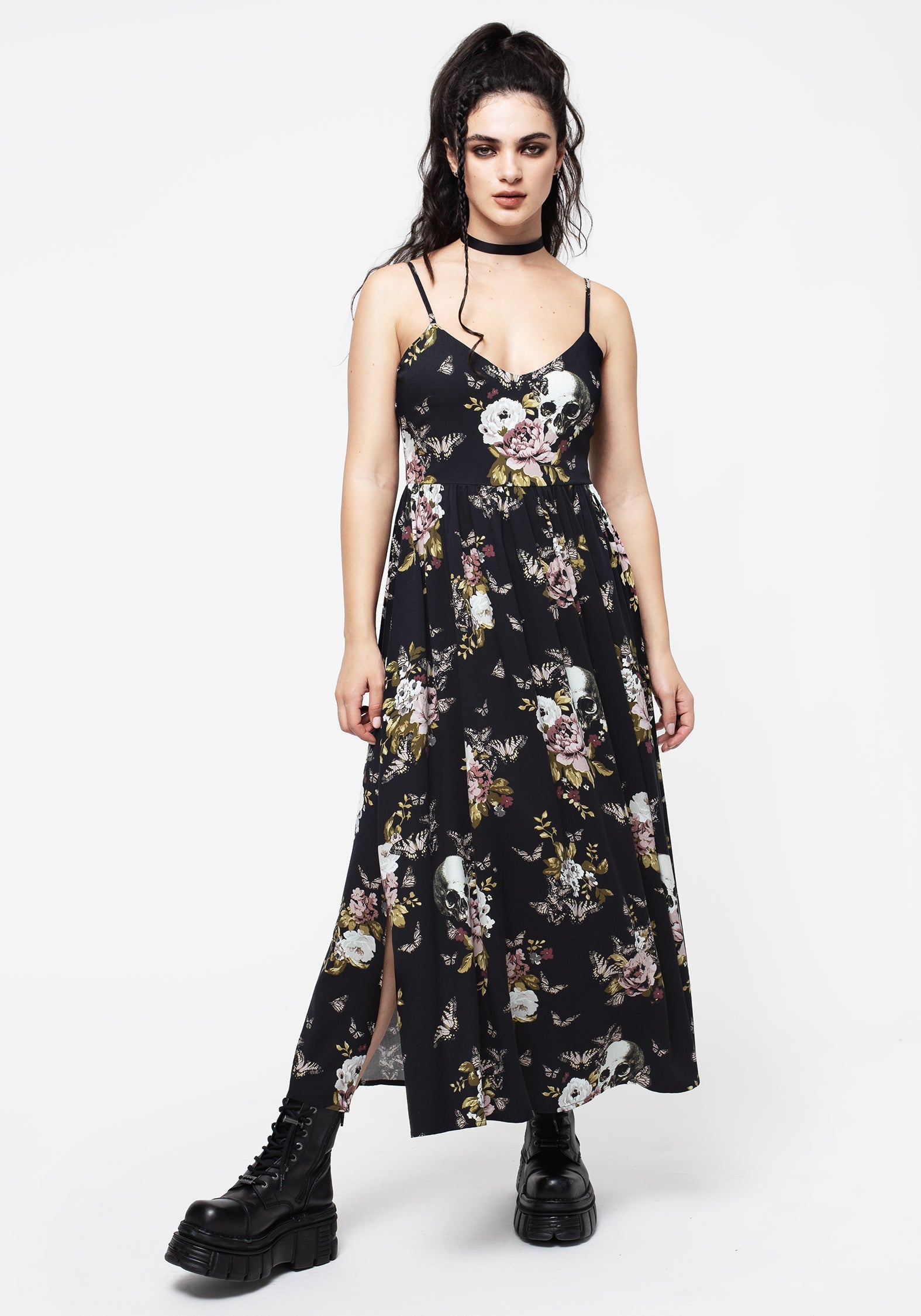 - Gothic floral rose, skull & butterfly print on a rich black base