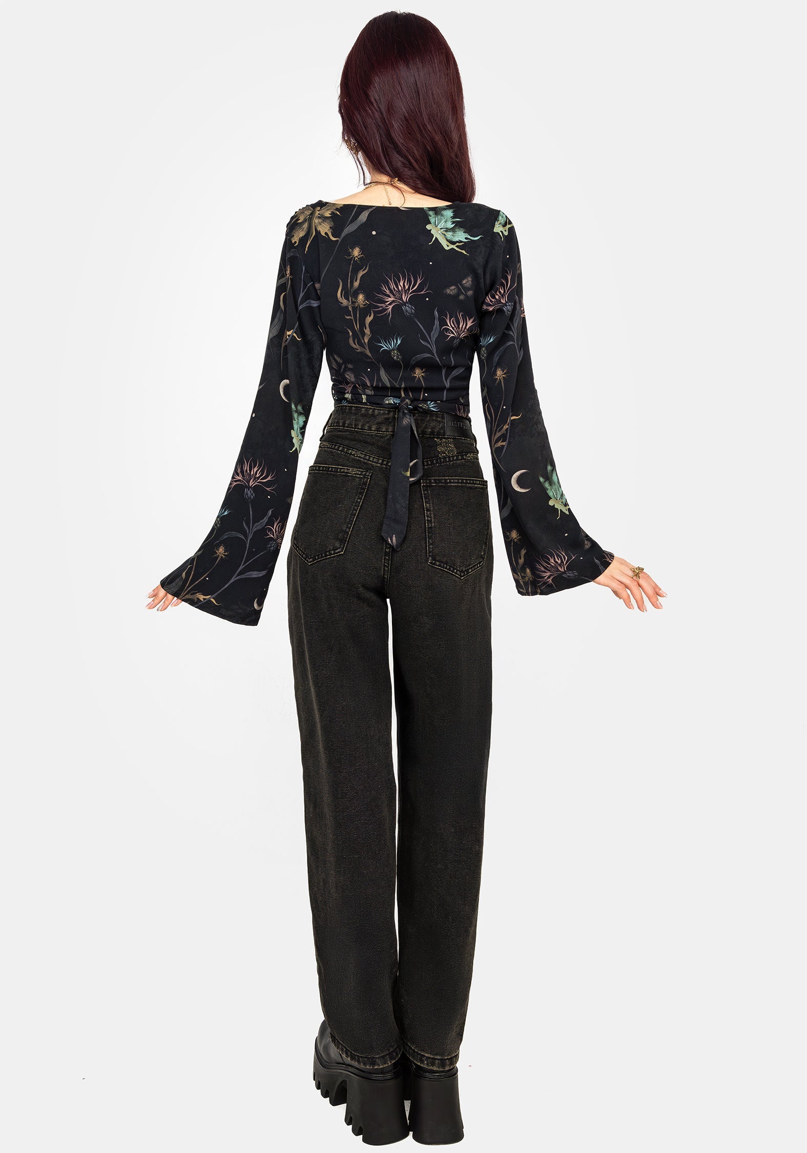 - Black floral fairy print flare sleeve wrap top