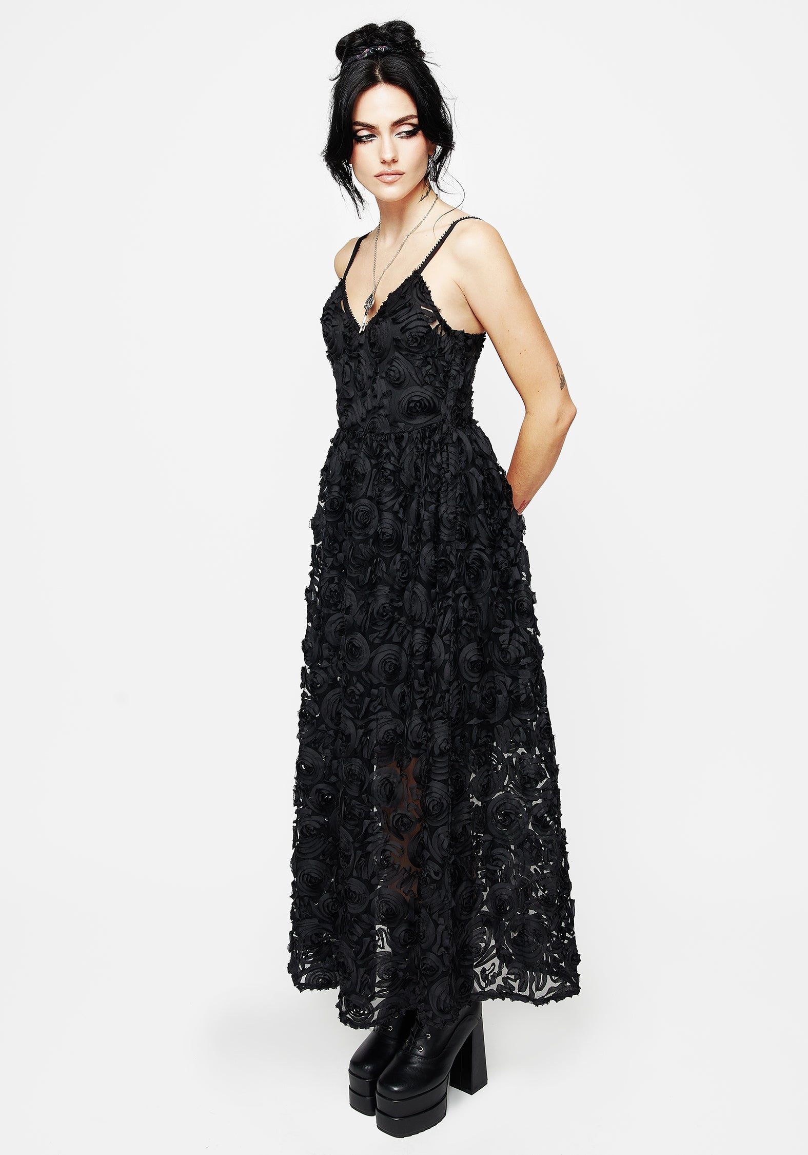 - Black rose textured mesh midi cami dress