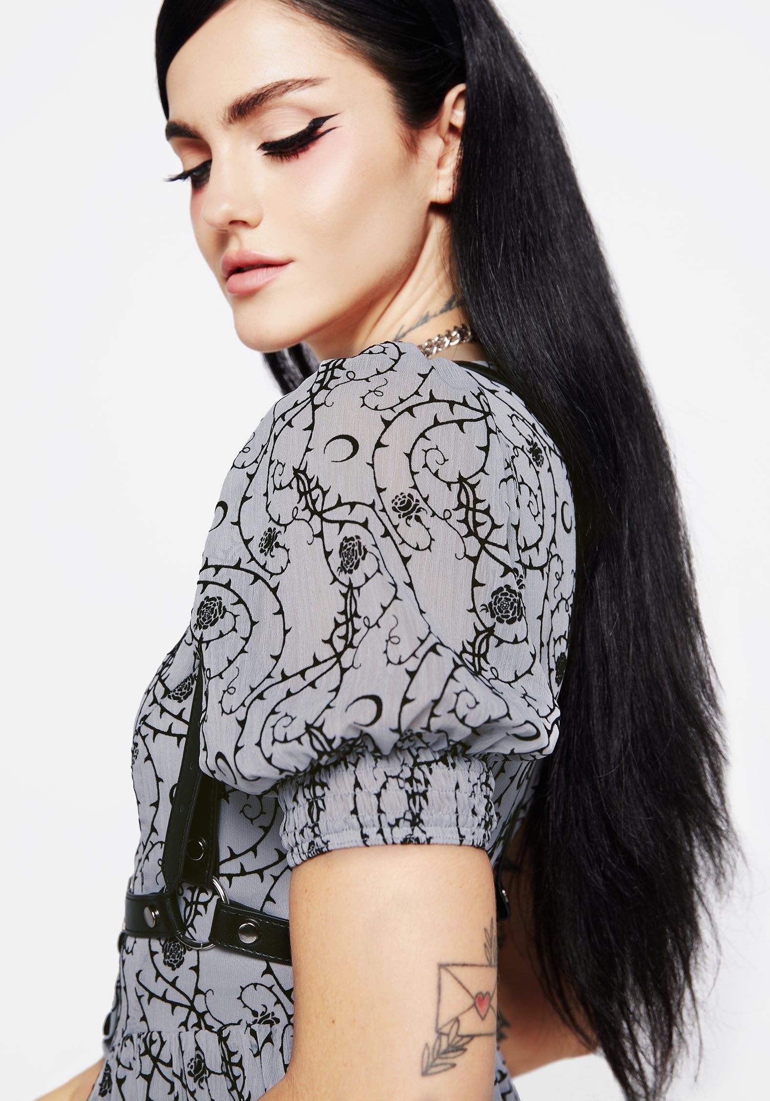 Rosethorn Flocked Velour Puff Sleeve Midaxi Dress - Blue