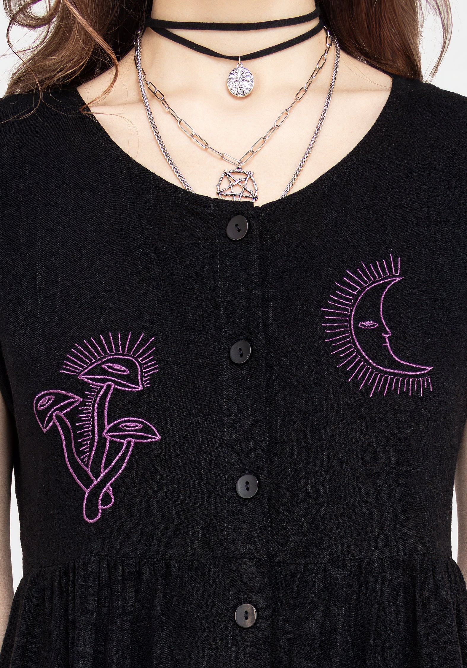 - Black embroidered button-up mini dress