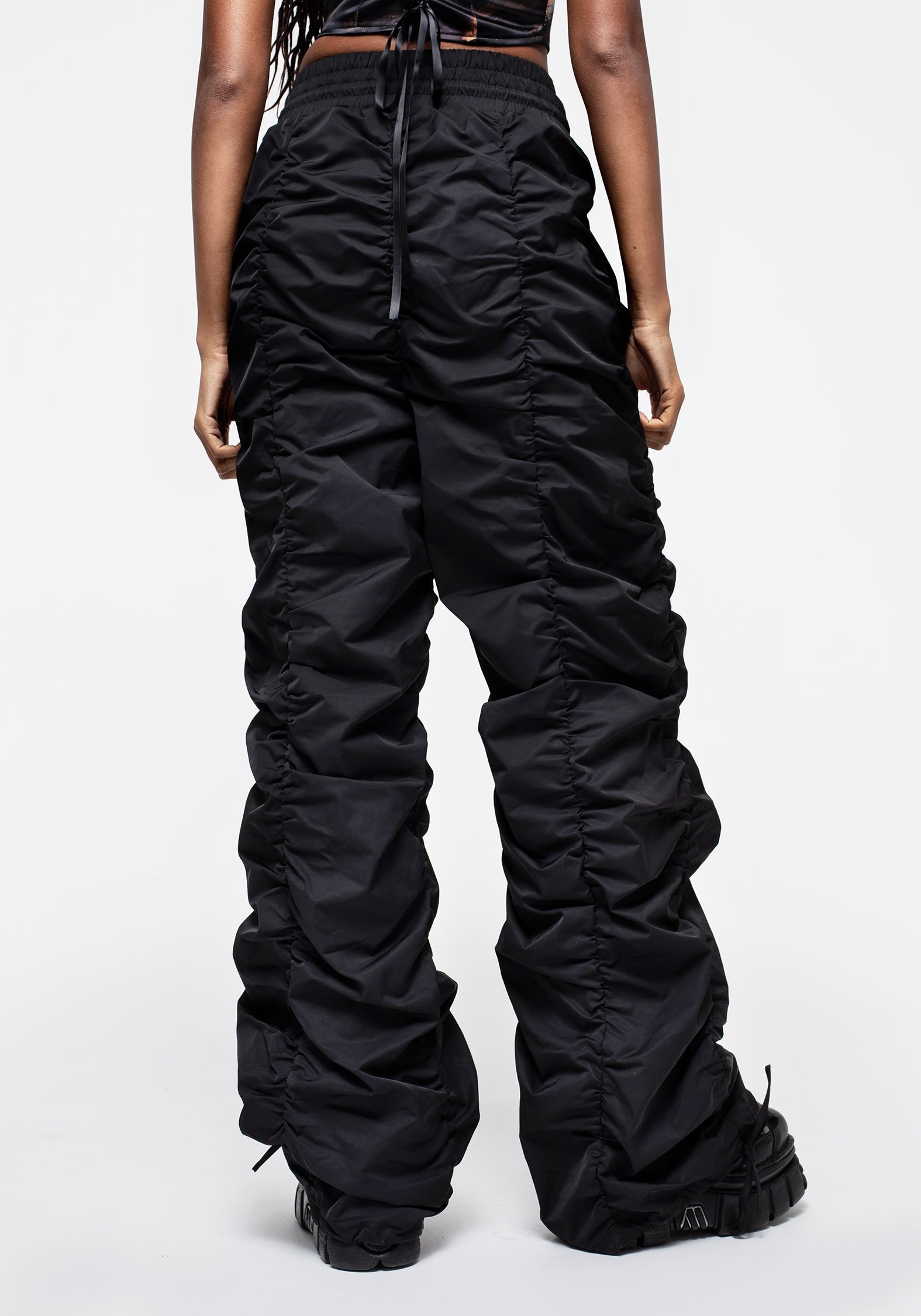 - Roomy wide legs with ruched front, back & side seams to add texture