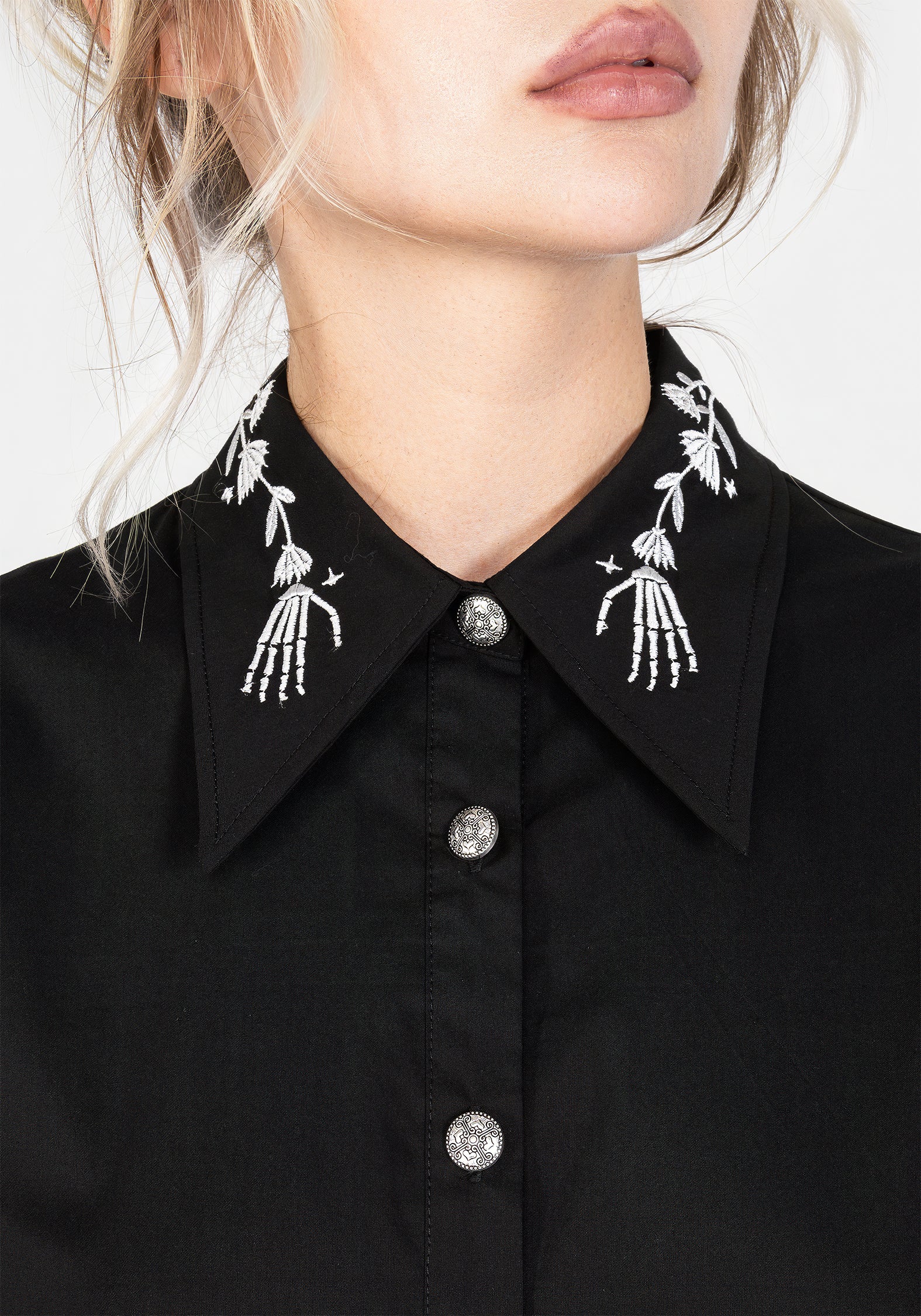 - Oversized pointed collar features white floral skeletal hand embroidery