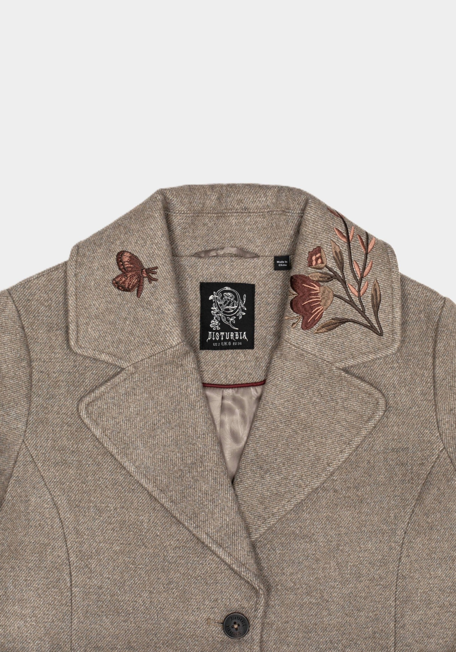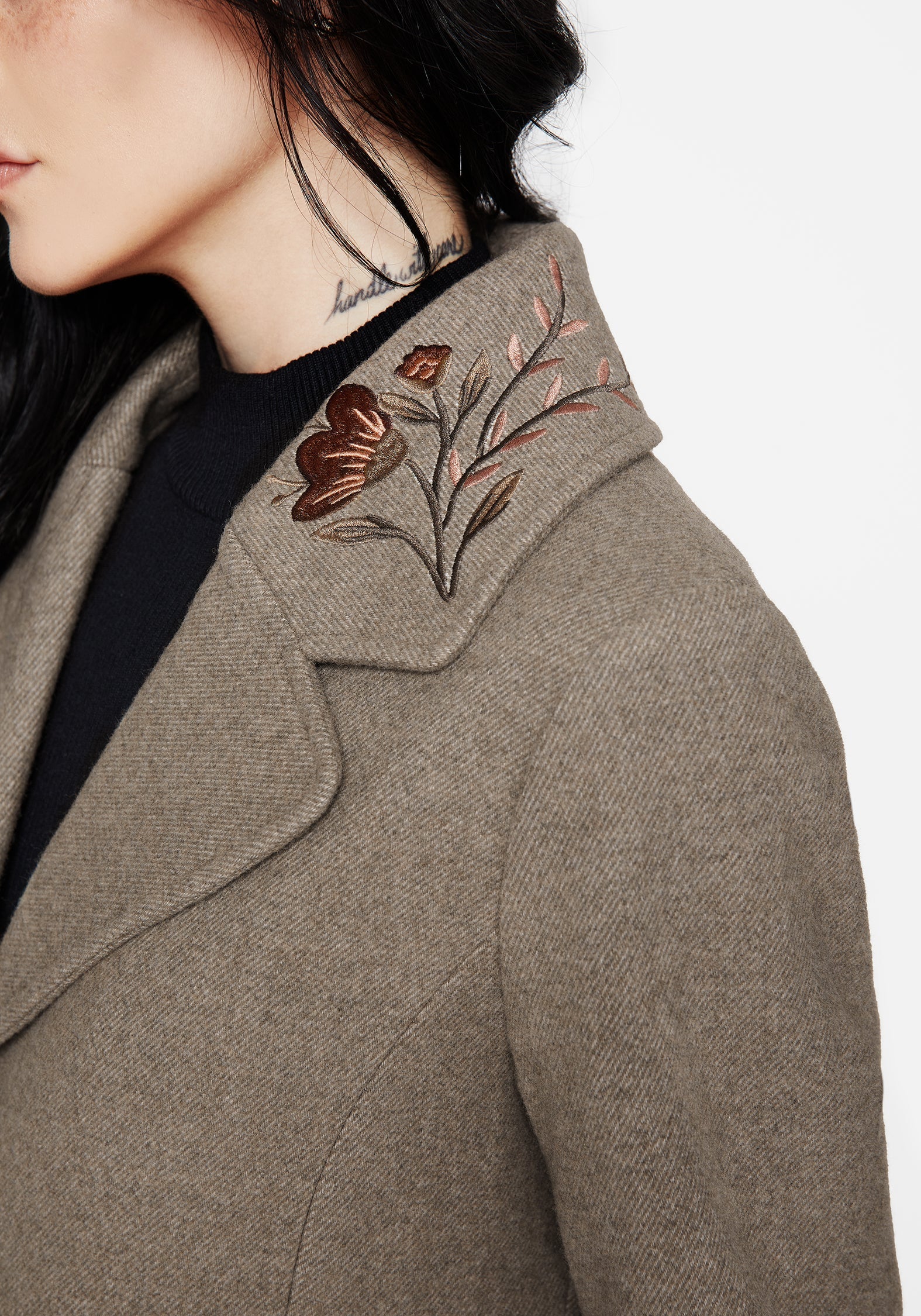 Valeria Floral Moth Embroidered Herringbone Longline Coat