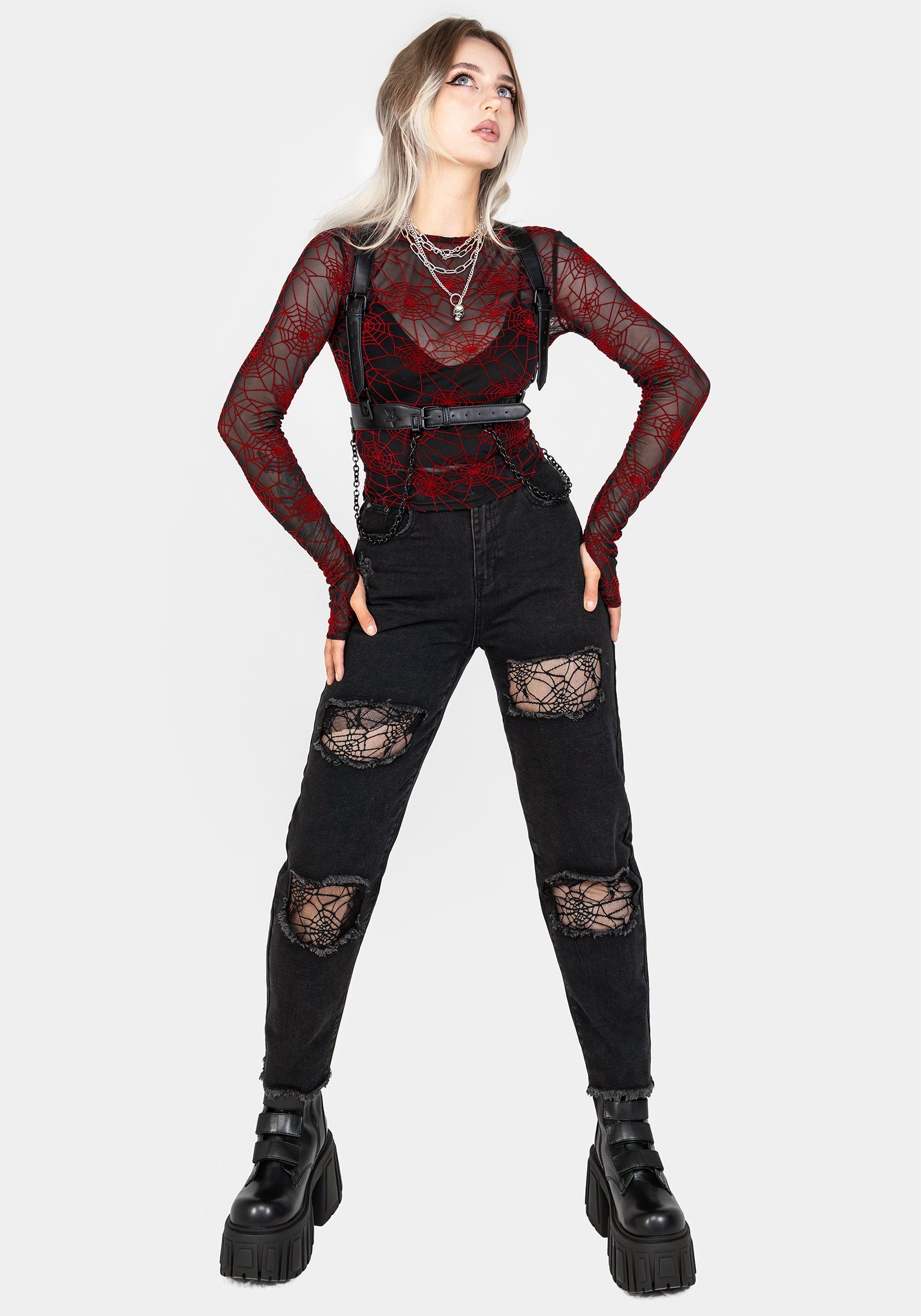 - Stretchy sheer mesh fabrication with red flocked velour spiderweb design