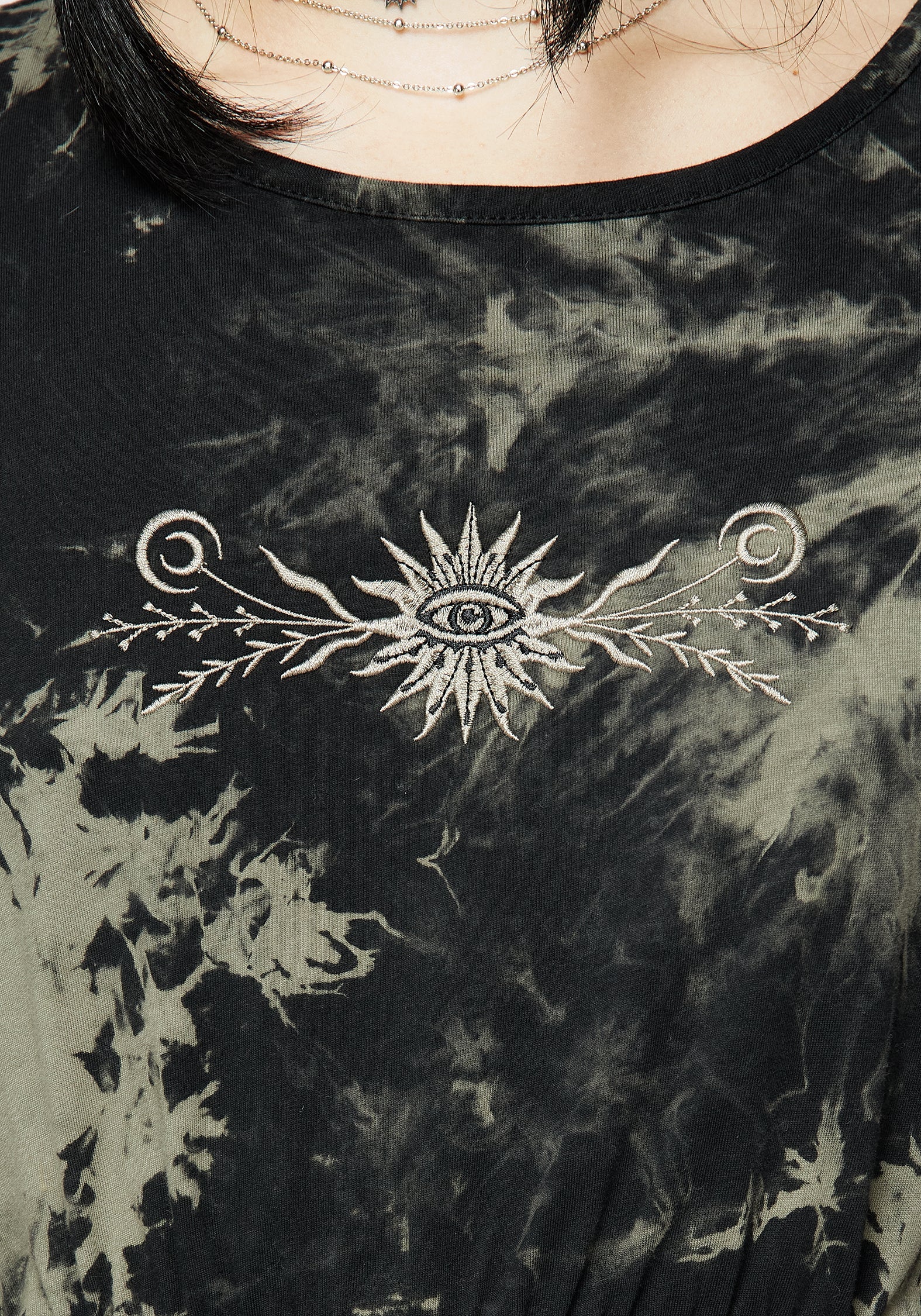 - Embroidered leaf & eye graphic on chest in a ghostly grey