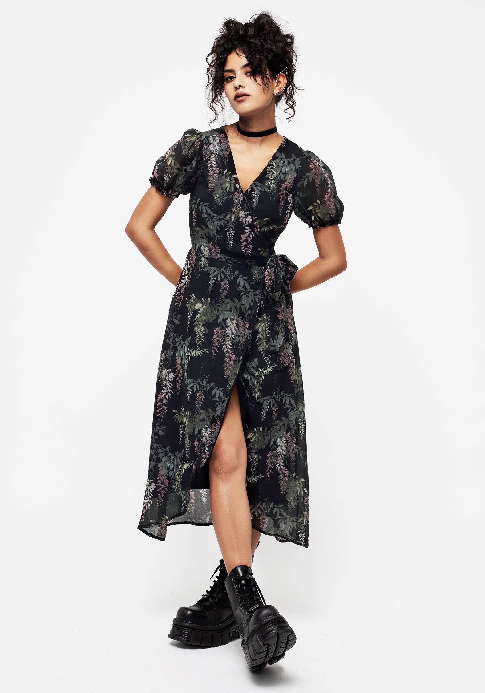 Wisteria Floral Print Chiffon Midi Wrap Dress