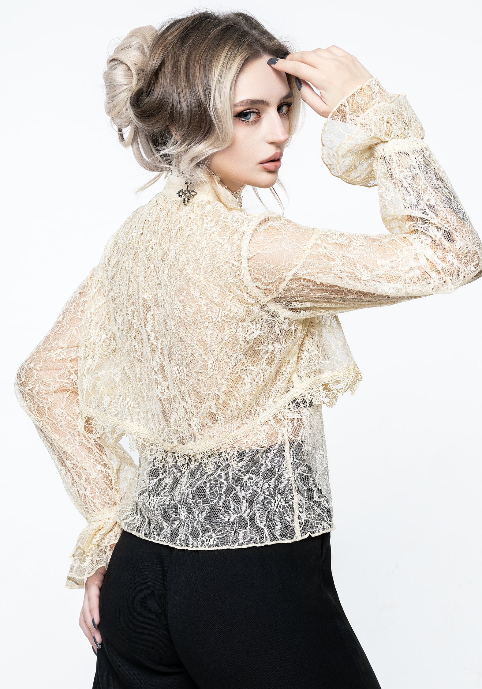 - Long puff sleeves with layered flared cuffs