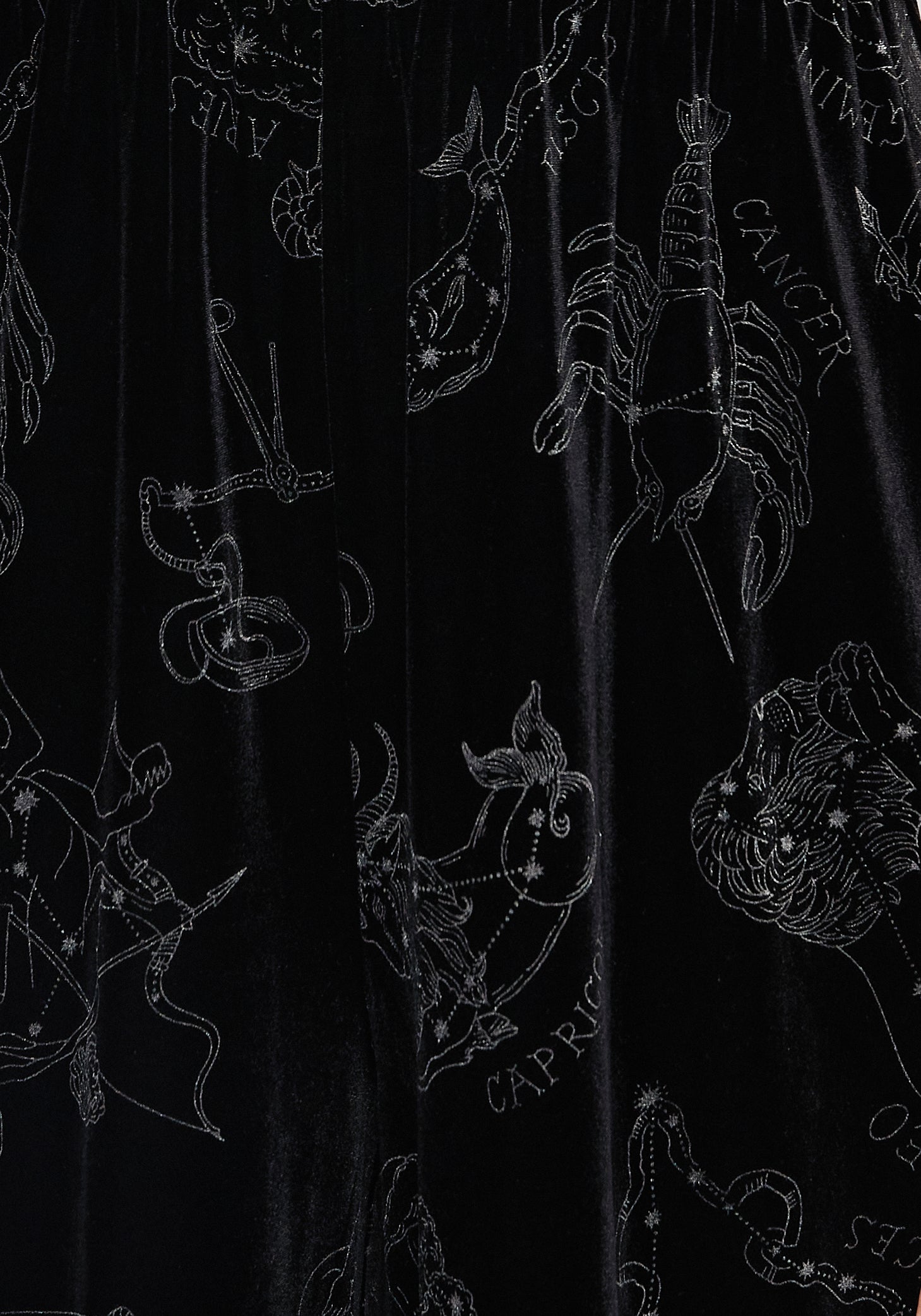 - Sumptuous stretchy black velour fabrication with all-over foiled zodiac print