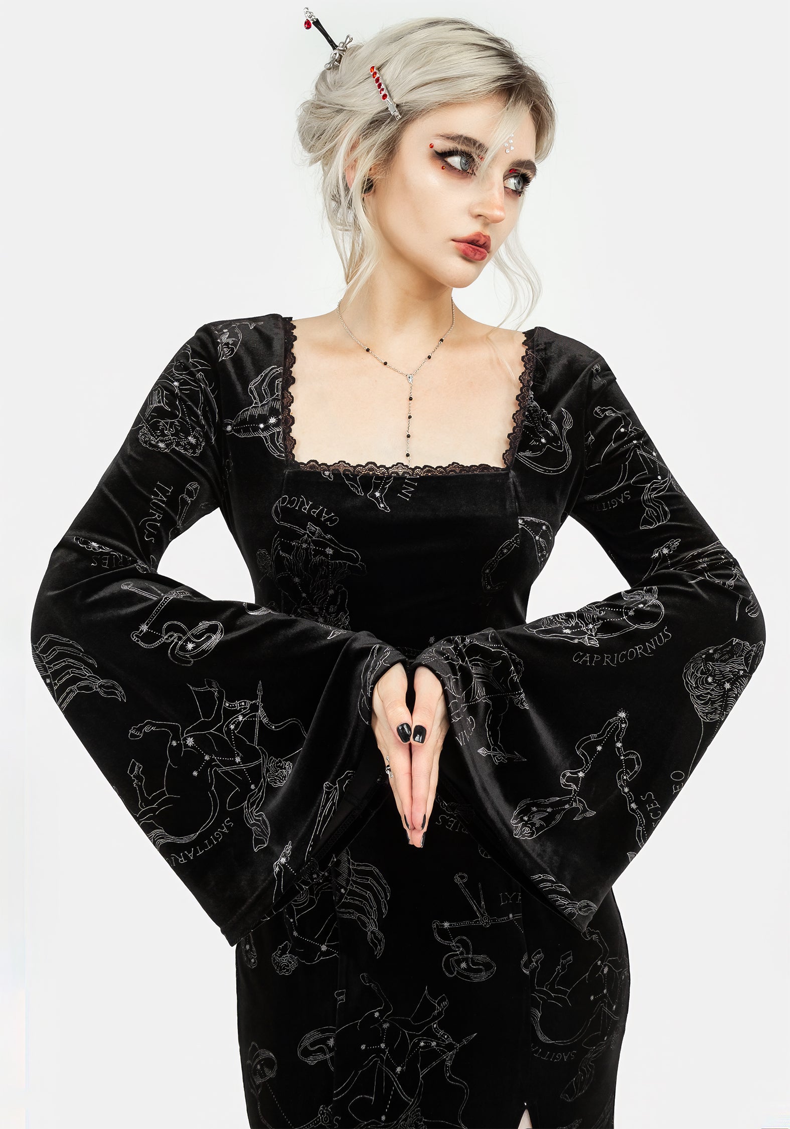 Zodiac Foil Print Velour Flute Sleeve Maxi Gown